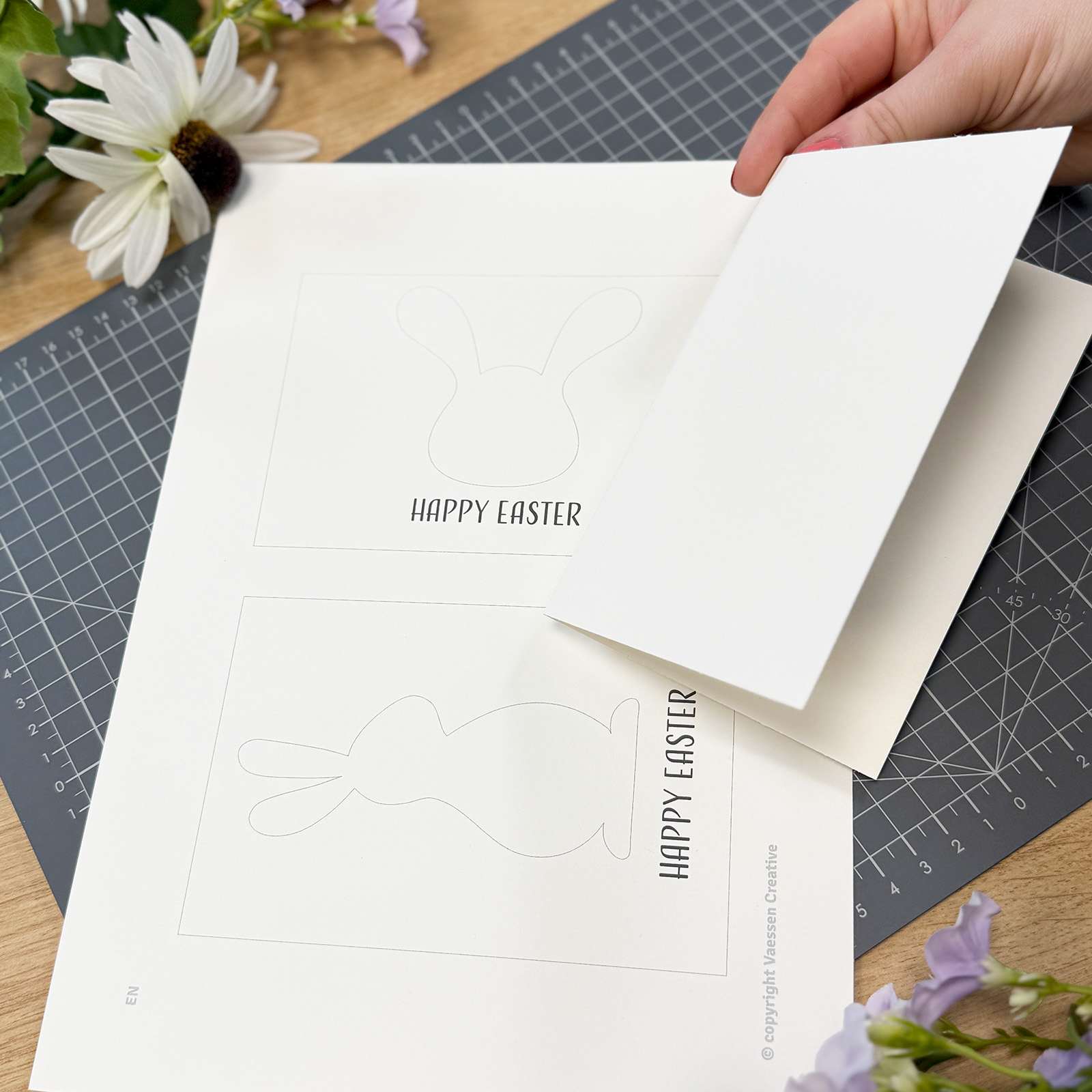 Drucken Sie die PDF aus und schneiden Sie das Design aus stabilem Cardstock aus. Wir haben cremefarbenen Cardstock verwendet. Übrig bleibt ein Stück von 10 x 15 cm.