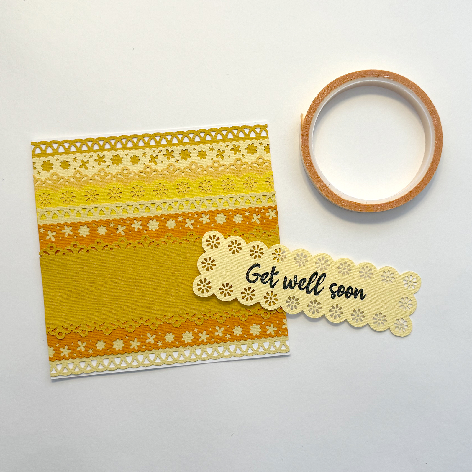 Möchten Sie beim Karten gestalten etwas Besonderes schaffen? Mit Randstanzen und verschiedenen Gelbtönen aus Cardstock entstehen lebendige Muster und Schichten. Diese handgemachte Genesungskarte ist schnell gemacht und bringt garantiert ein Lächeln ins Gesicht.