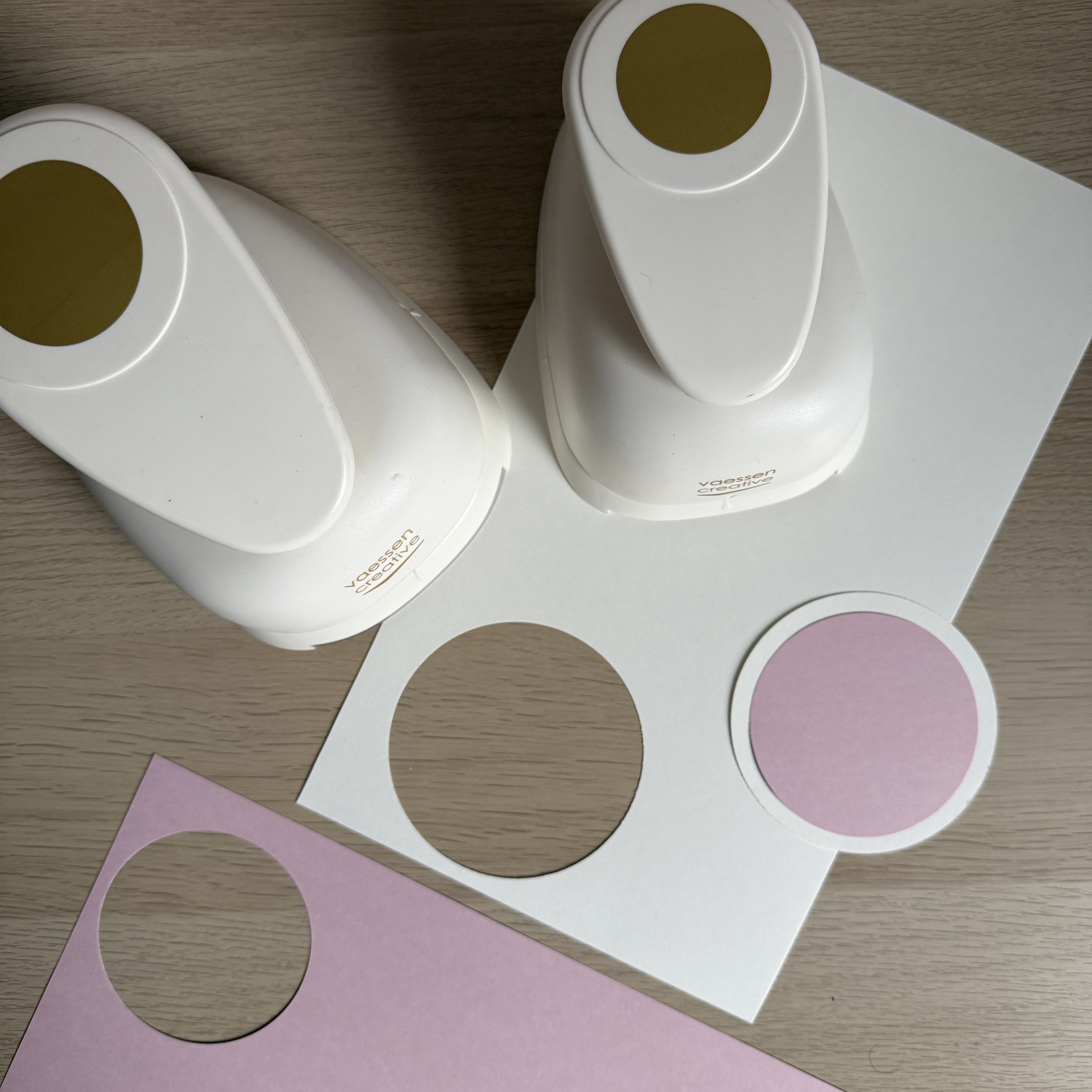 Stanzen Sie anschließend zwei weiße Kreise und zwei rosafarbene Herzen aus.