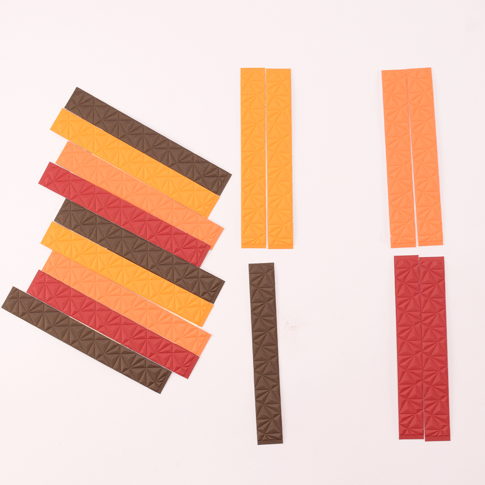 Im geprägten Papier sind gerade Linien sichtbar. Schneiden Sie entlang dieser Linien Streifen von ca. 2,1 cm Breite. Bewahren Sie die Streifen in der geschnittenen Reihenfolge auf, da dies für das diagonale Muster wichtig ist.