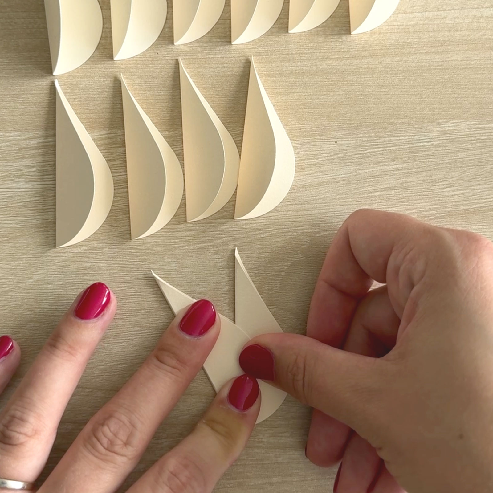 Verwenden Sie die Tropfenstanze, um 12 Tropfen aus einem Streifen zu stanzen. Abwechselnd arbeiten: zuerst links, dann rechts, jeweils etwas tiefer, um Papier zu sparen.