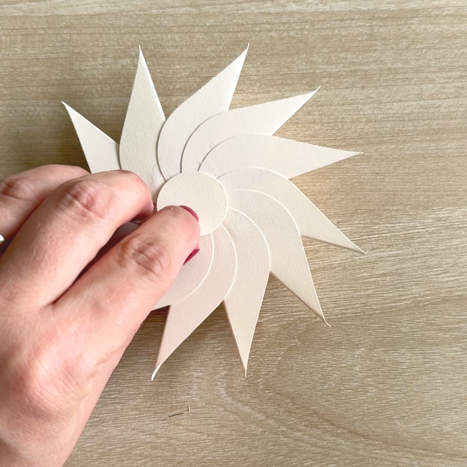 Kleben Sie abschließend den kleinen Kreis auf die Rückseite des Sterns für zusätzliche Stabilität. Die vorderen Halb-Tropfen dürfen leicht nach oben stehen für einen verspielten Effekt.