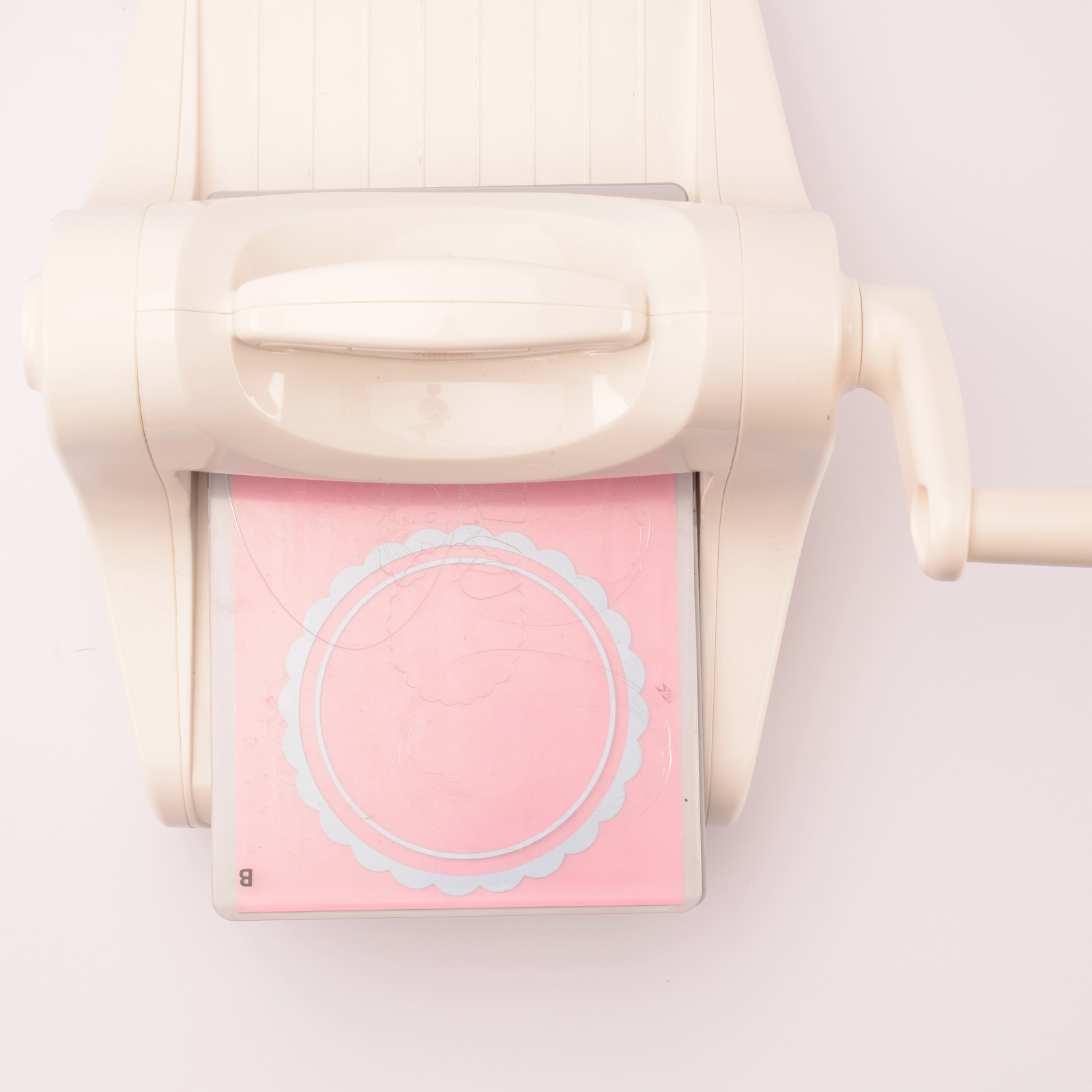 Nehmen Sie den Kreis aus Schritt 3 und platzieren Sie die kleinste runde Stanzform schräg darauf, um eine Mondsichel zu erstellen. Führen Sie es durch die Stanzmaschine.