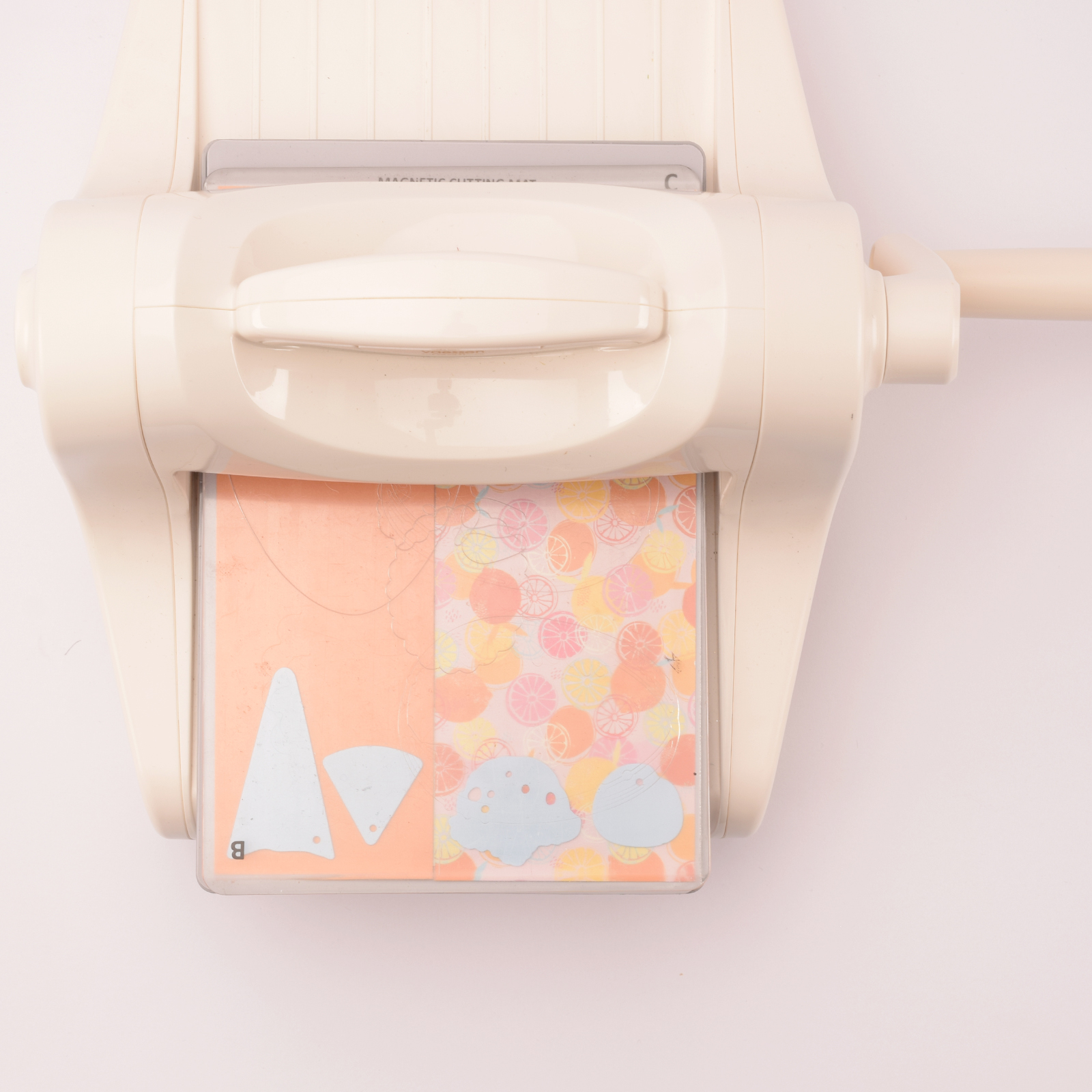 Legen Sie dasselbe Blatt nun mit dem Zitronenmuster nach oben. Verwenden Sie dieselben Stanzformen in einer kleineren Größe und führen Sie es durch die Stanzmaschine.