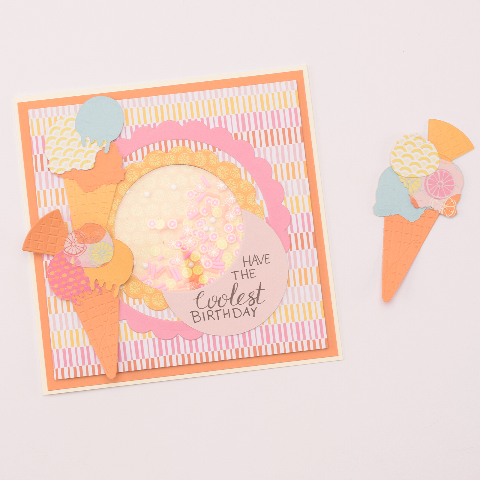 Nehmen Sie den aufbewahrten Kreis aus Schritt 5 und legen Sie ihn mit dem Zitronenmuster auf die Shakables. Kleben Sie ihn fest. Bringen Sie Foam-Pads an den Rändern an und befestigen Sie alles auf der Kartenbasis aus Schritt 2.