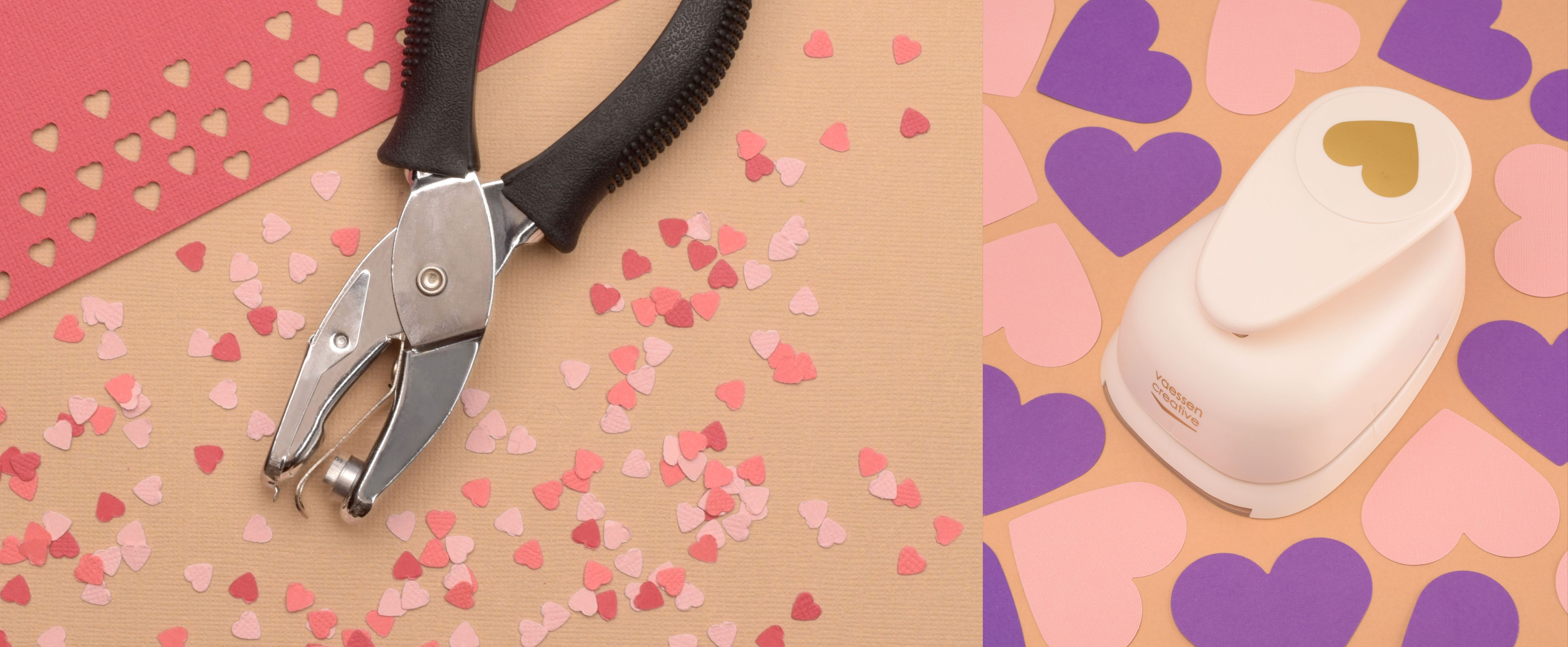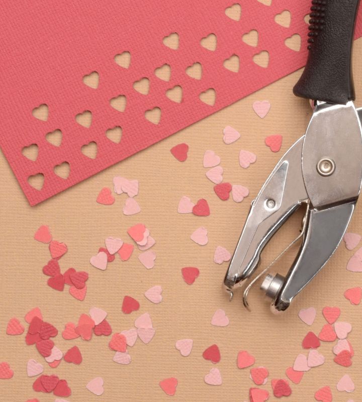 DIY heart-shaped gift tags made with cardstock and a heart punch, shown with confetti and punched shapes.