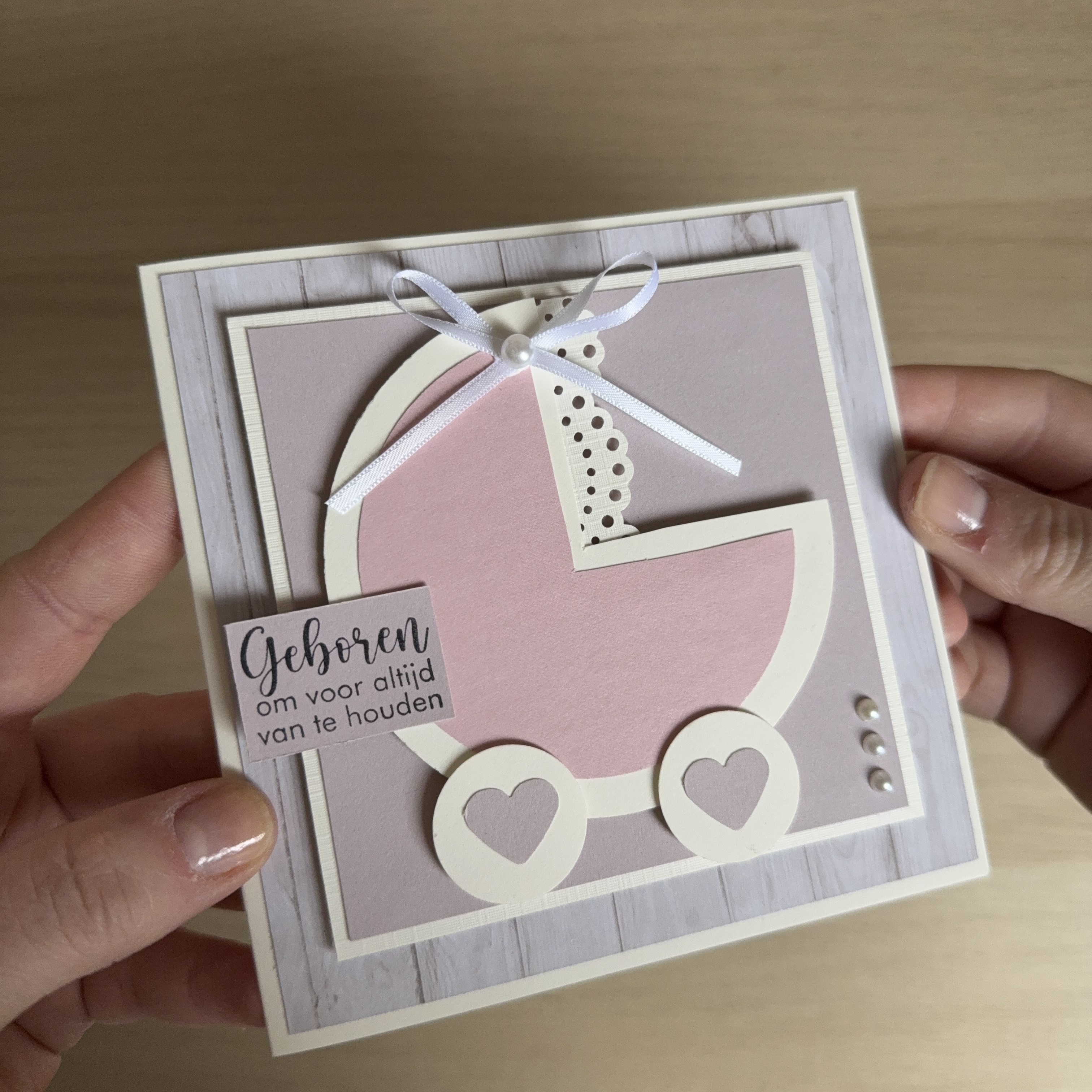 Finish the card with adhesive pearls, a stamped sentiment, and a small satin ribbon bow.