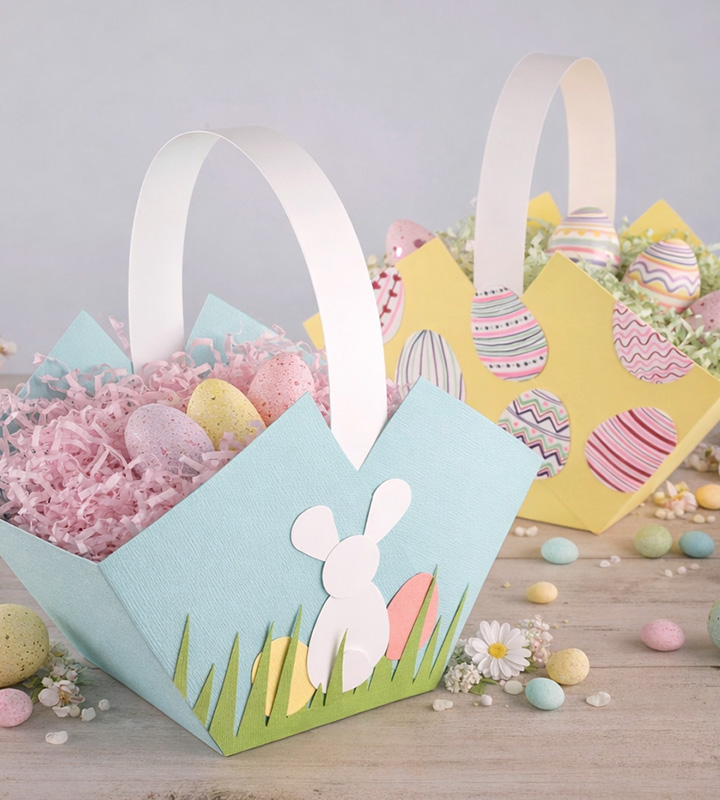 For the second example, cut a strip of ‘grass’ from green cardstock. Use shape punches to make a bunny and punch out eggs. Glue the grass, bunny and eggs onto the basket.