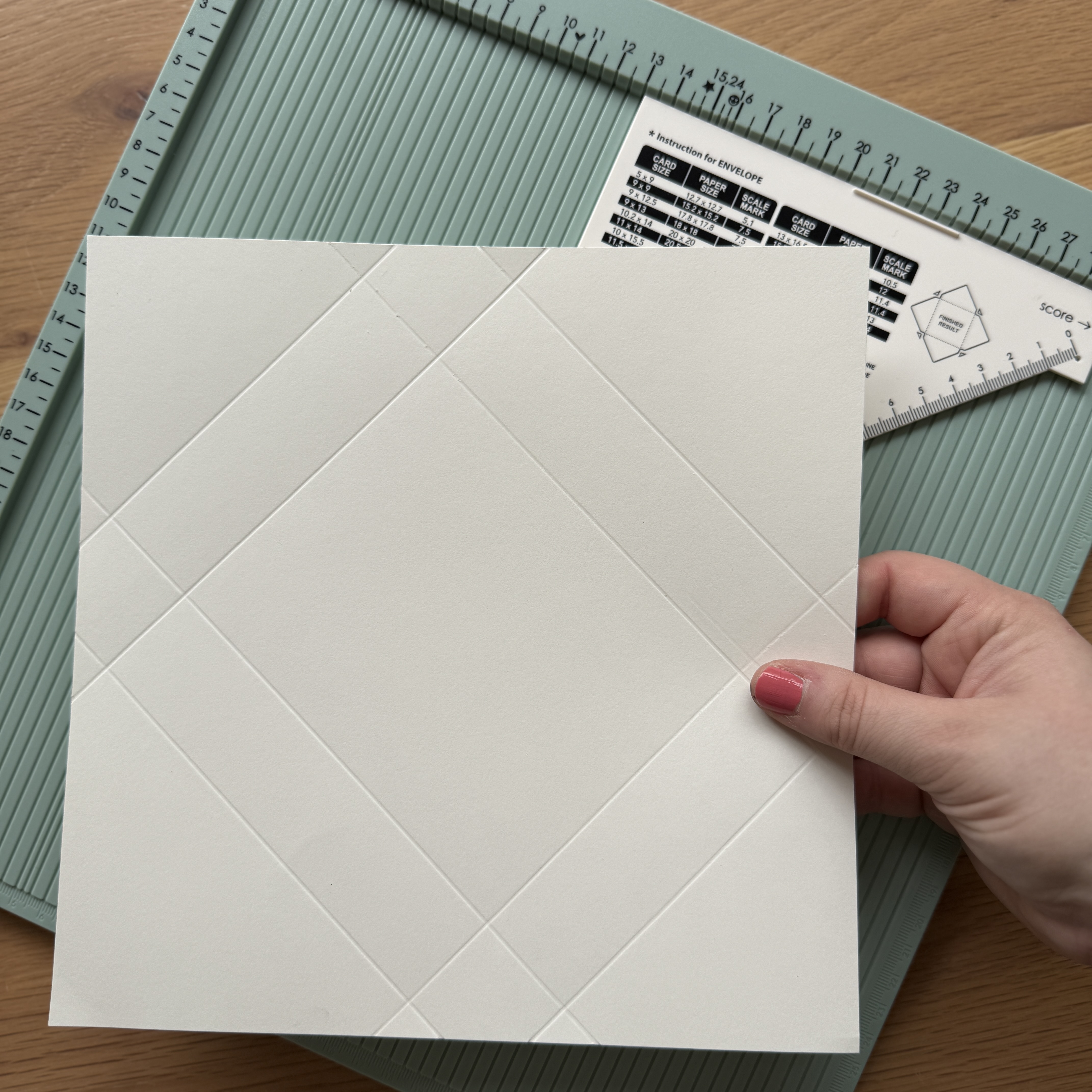 Cut a piece of paper measuring 9 x 9 inches (22.9 x 22.9 cm). Score it at 4 inches (10.2 cm) and 5.7 inches (14.6 cm) (follow the envelope box instructions).