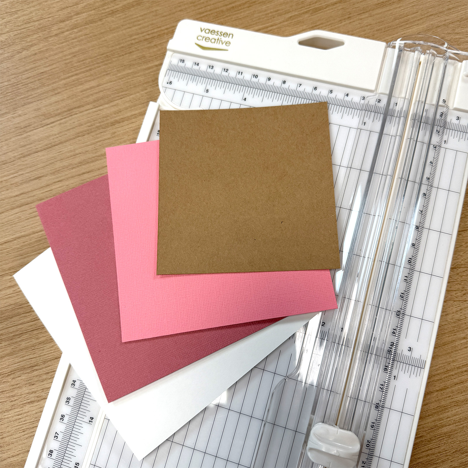 Cut a top-fold card measuring 5.1 x 5.1 inches (13 × 13 cm). Then cut the following pieces of paper: dark red 4.9 x 4.9 inches (12.5 × 12.5 cm), light pink 4.7 x 4.7 inches (12 × 12 cm), and kraft paper 3.9 x 3.9 inches (10 × 10 cm).
