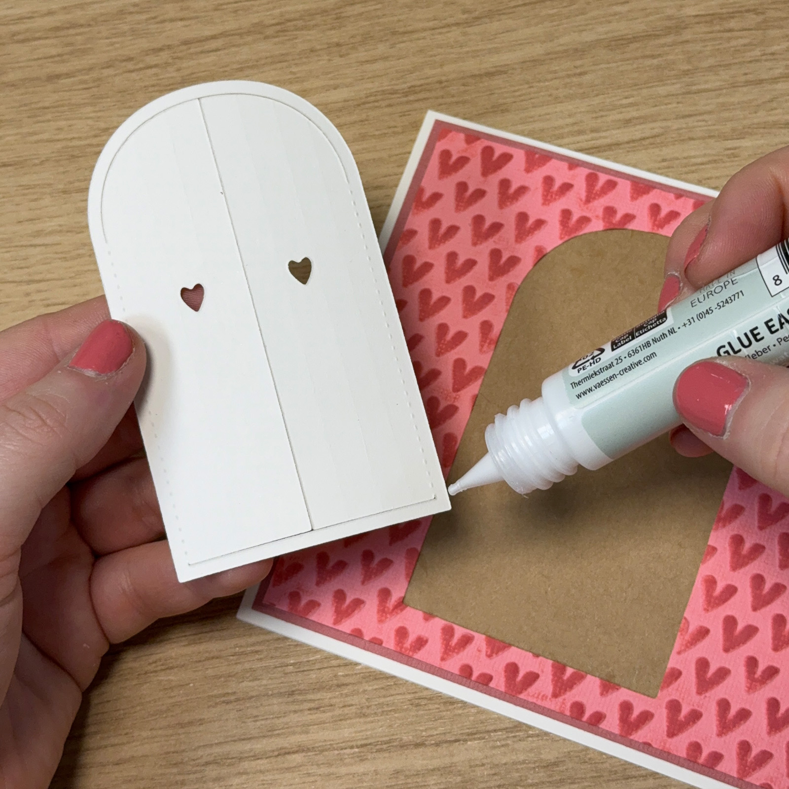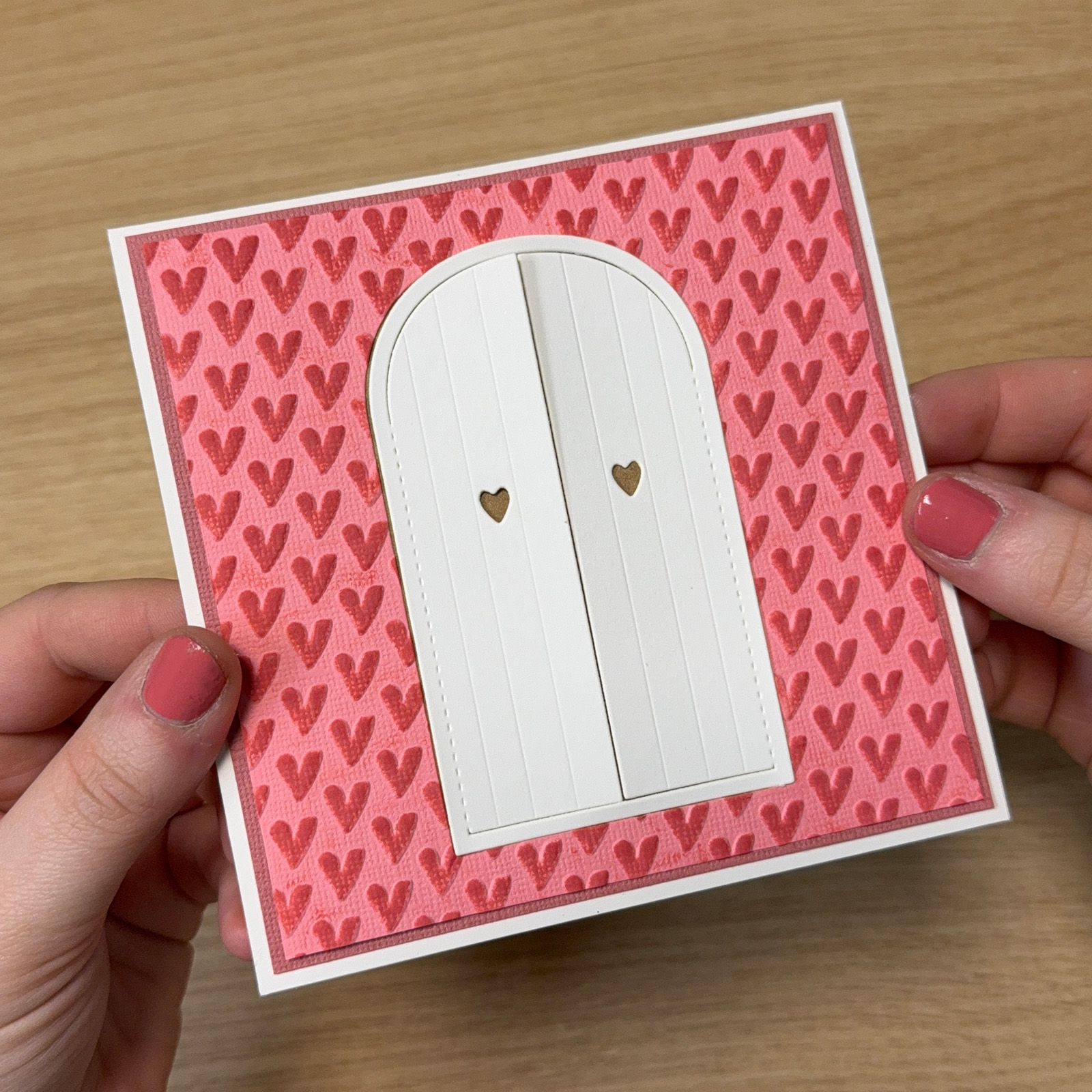 Die-cut a door from the light pink paper and die-cut the same door again from white paper.