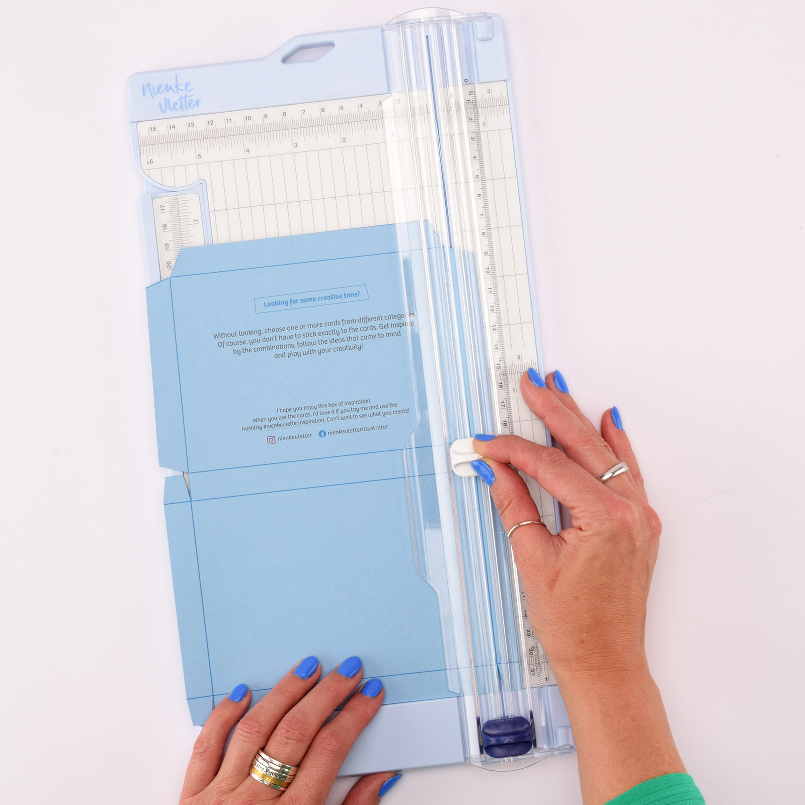 Ahora vamos a hacer las tarjetas. Corta todas las tarjetas con la guillotina. Para ahorrar tiempo, puedes cortar dos hojas de hasta 200 g al mismo tiempo.