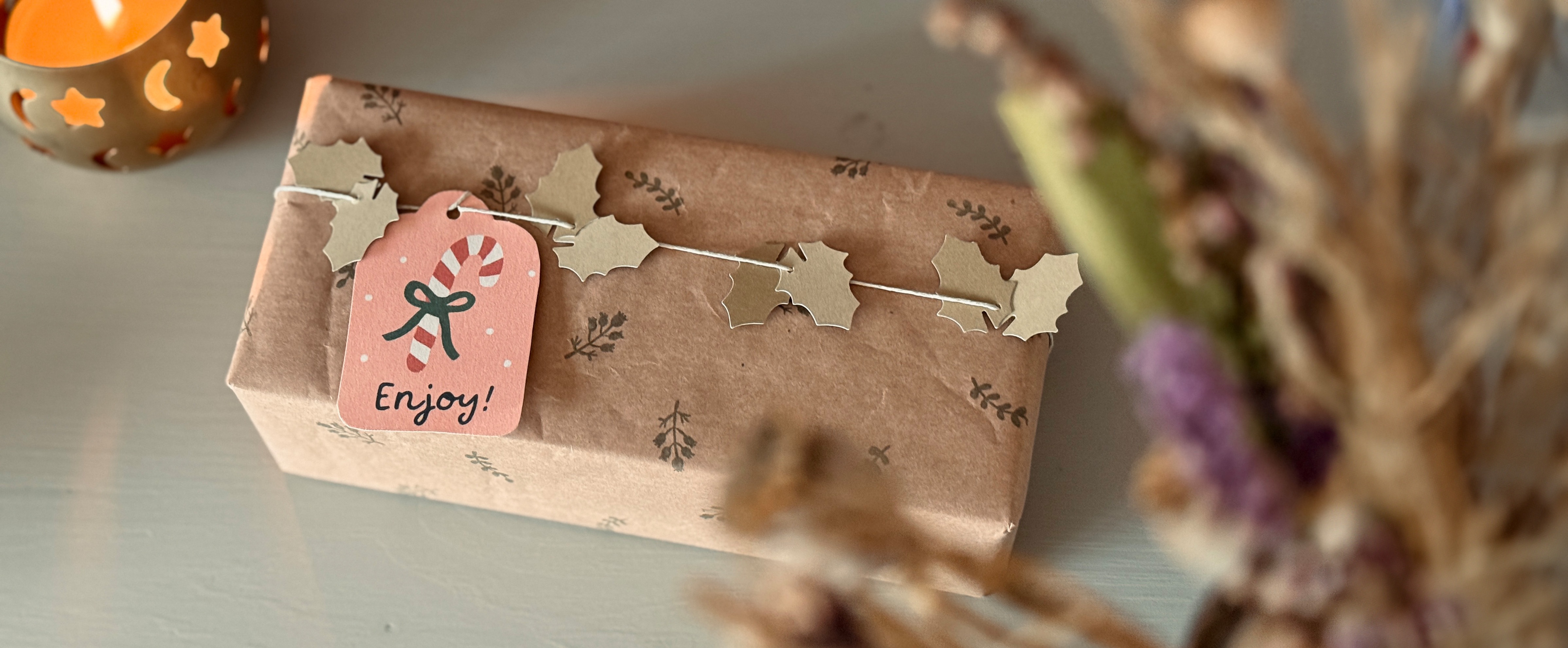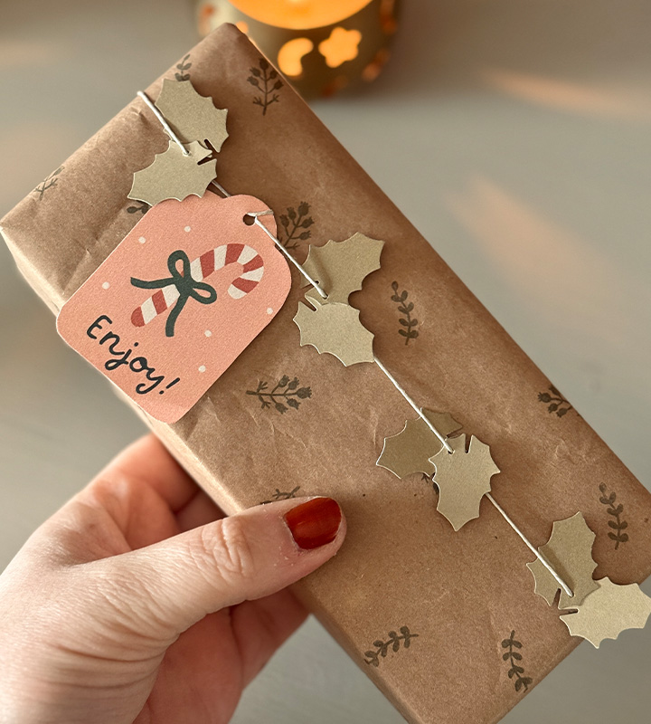 Haz que tus regalos navideños sean aún más festivos con una cinta hecha a mano de hojas de acebo de cartulina. ¡Añade etiquetas navideñas gratis para una manualidad navideña personalizada!