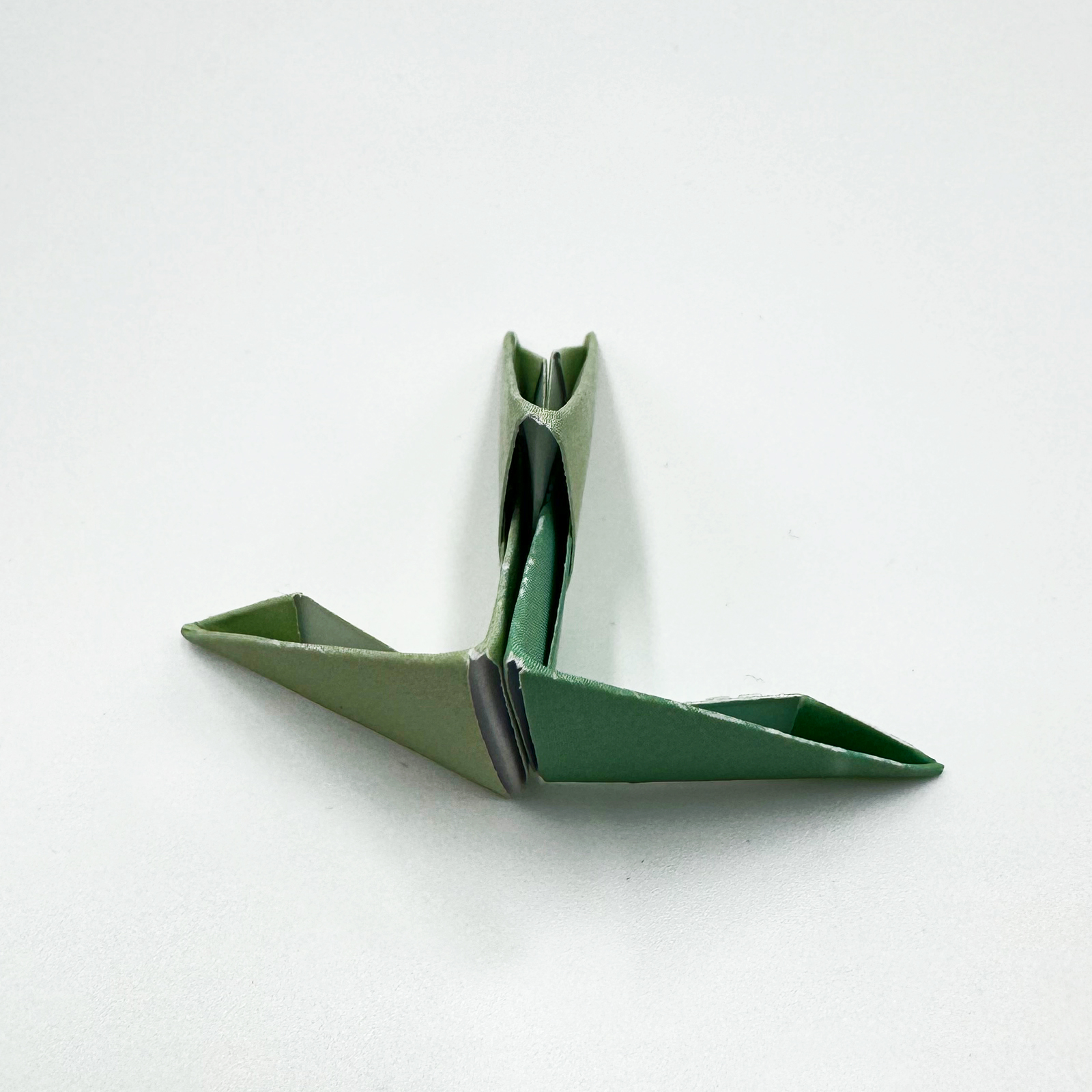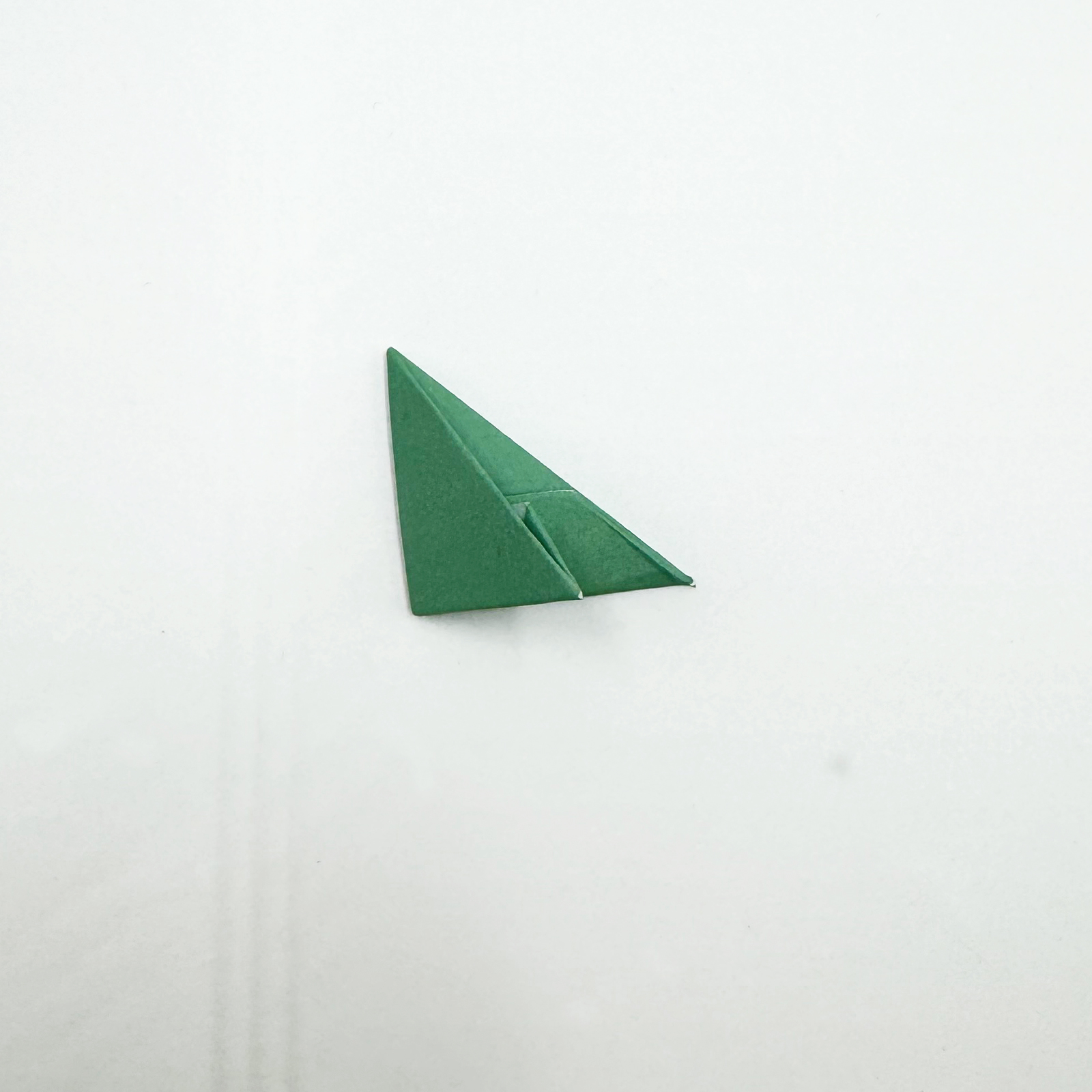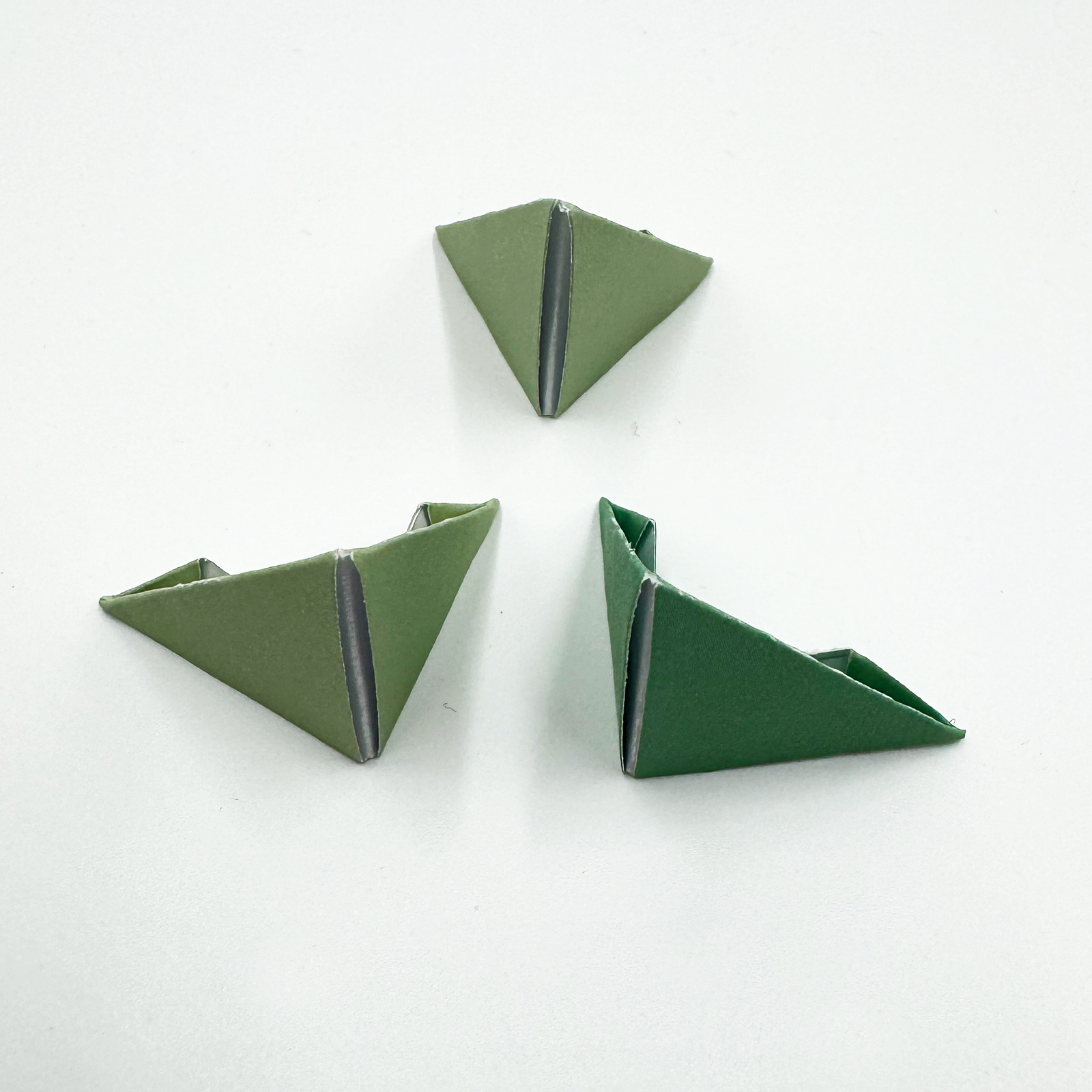Toma un triángulo verde claro como inicio y desliza la mitad de la punta de otro triángulo en la abertura trasera. Haz lo mismo con el verde oscuro.