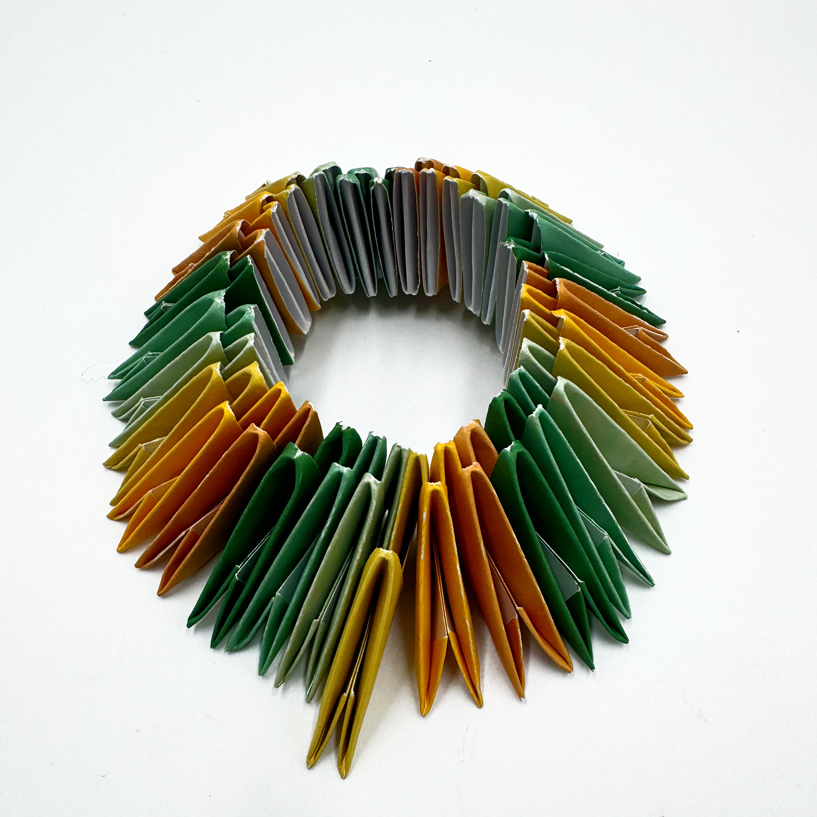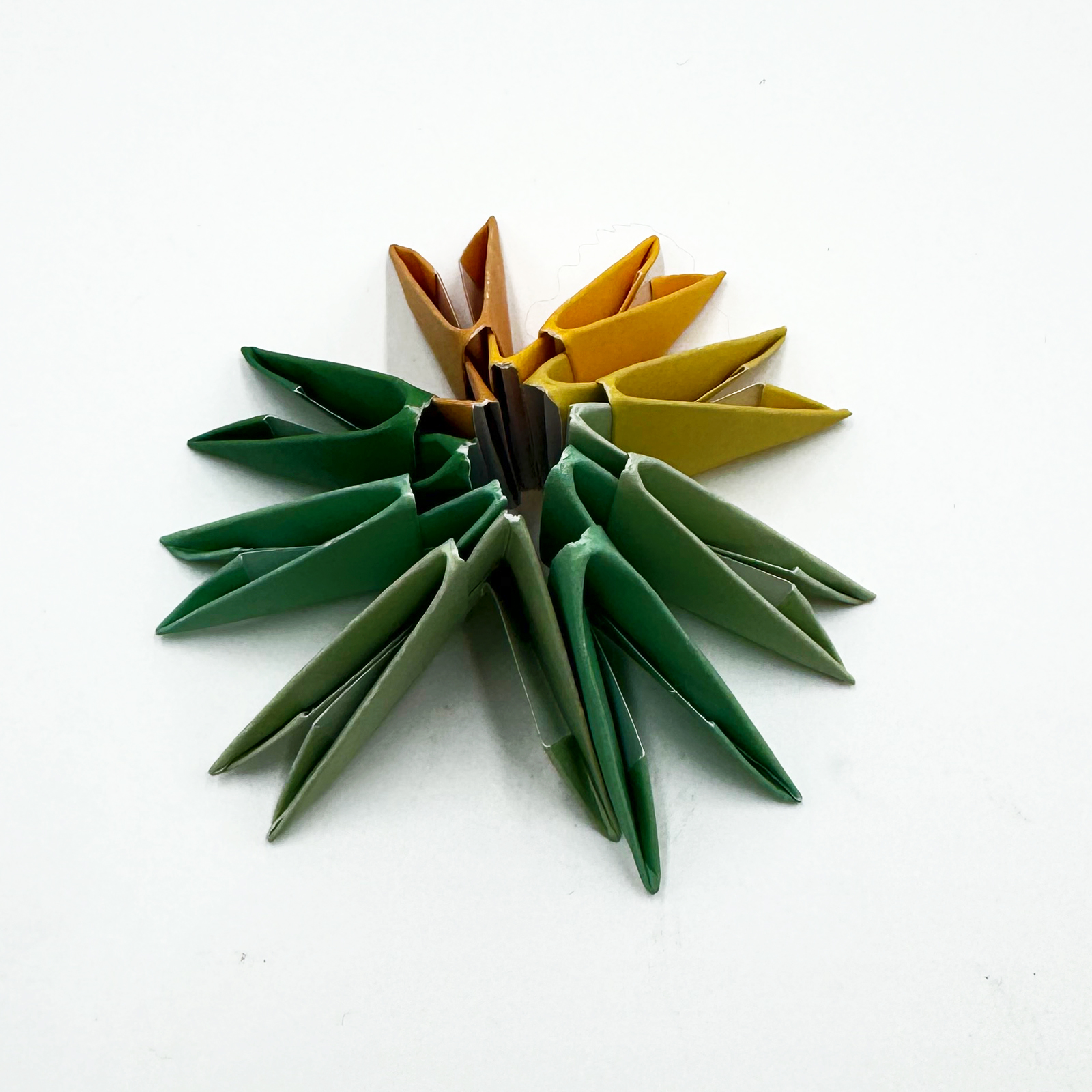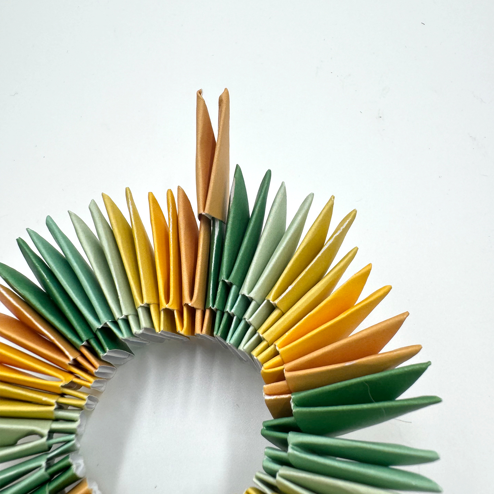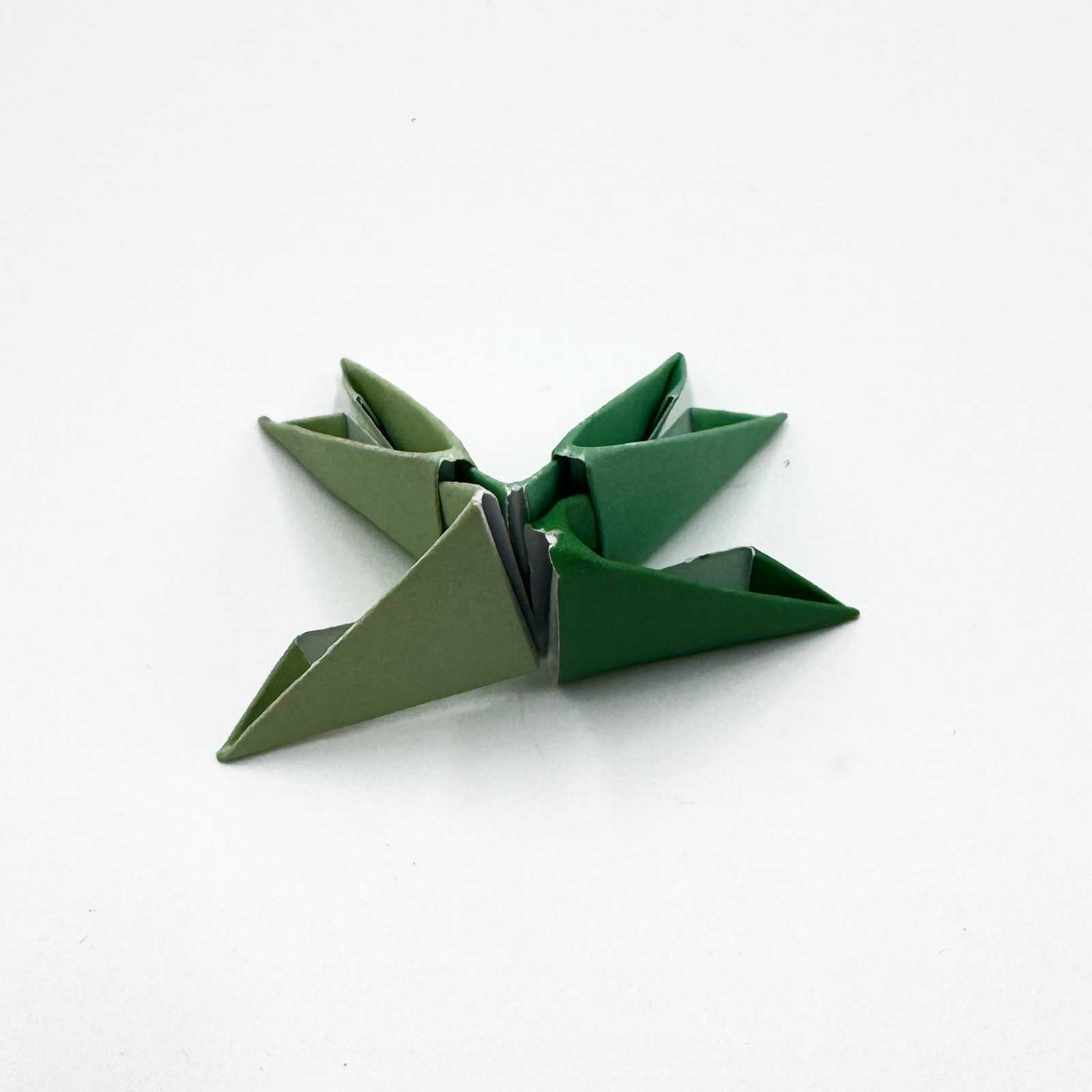 Toma un triángulo verde claro como inicio y desliza la mitad de la punta de otro triángulo en la abertura trasera. Haz lo mismo con el verde oscuro.