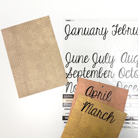 Utiliza la hoja de pegatinas de Kaisercraft para colocar las pegatinas de los meses en las 12 hojas.