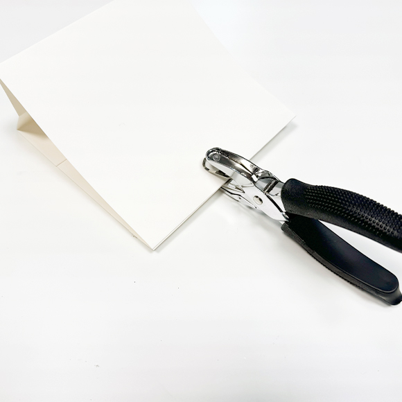 Haz un agujero en la parte superior central de cada hoja. Truco: coloca una hoja ya perforada encima o marca la posición con lápiz.