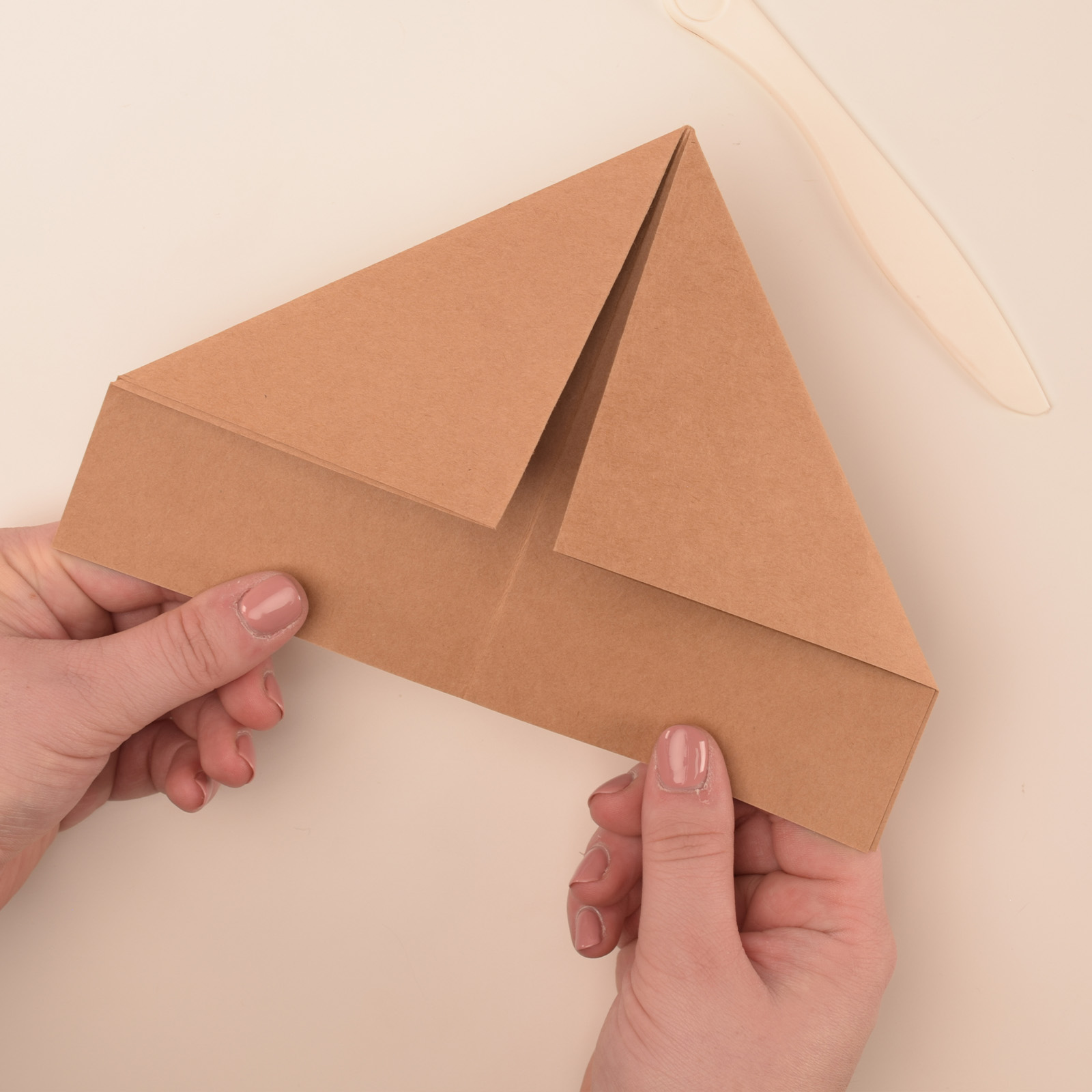 Sostén el papel con el borde doblado arriba y dobla las esquinas superiores izquierda y derecha hacia abajo hasta la línea central. Se forma un triángulo en la parte superior.