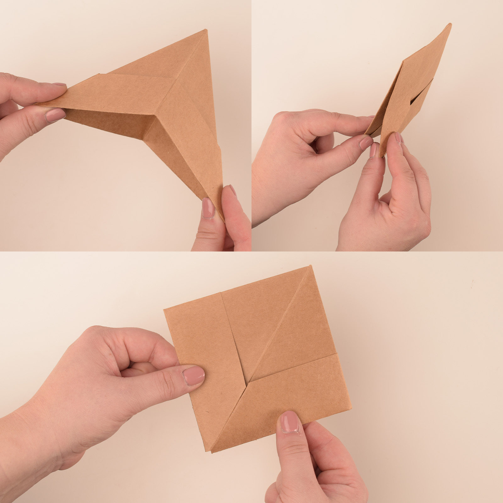 Abre nuevamente la parte inferior y separa las puntas para formar otra vez un cuadrado.