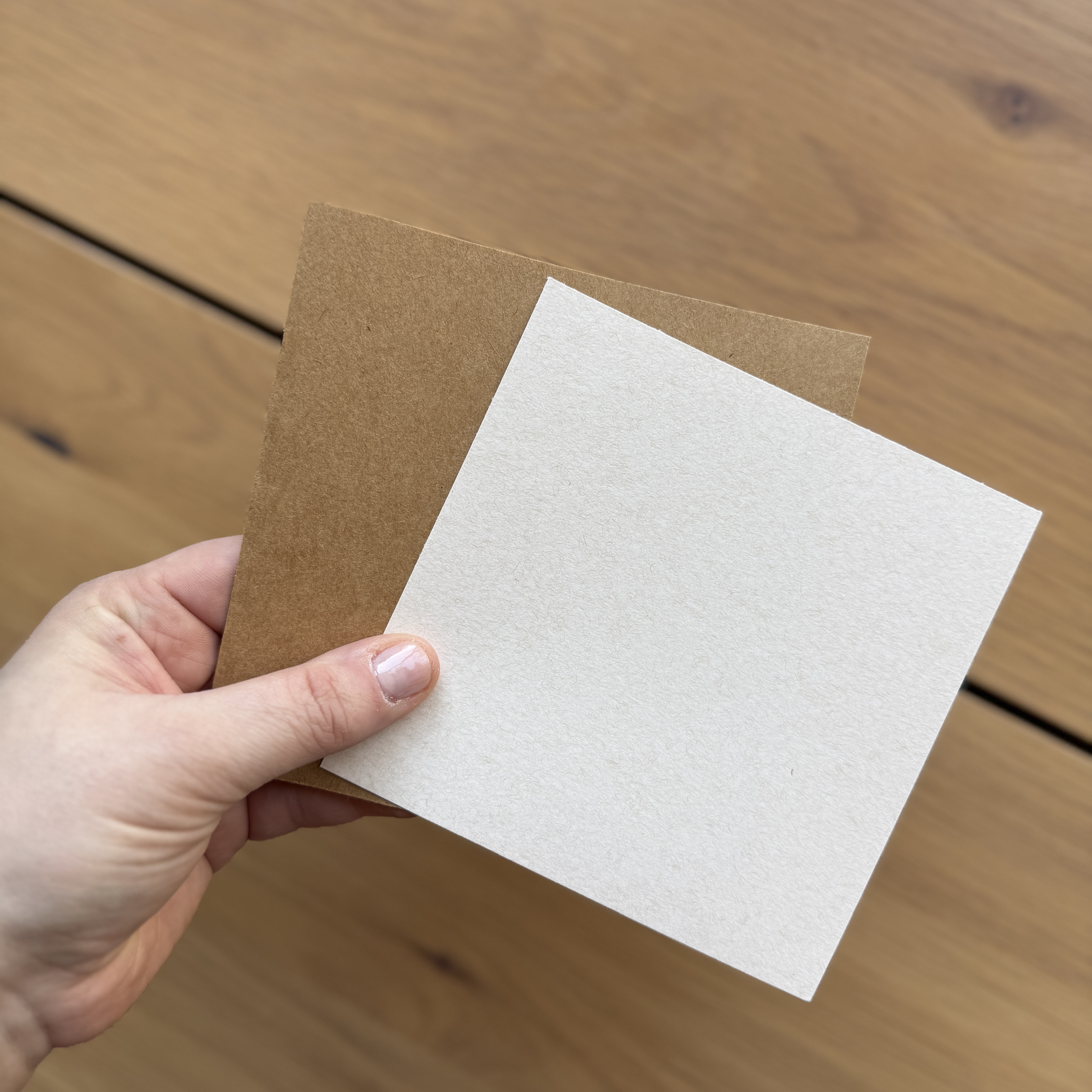 Corta una tarjeta doble de papel kraft oscuro de 26 x 13 cm (doblada: 13 x 13 cm). Corta también un cuadrado de papel kraft claro de 12,5 x 12,5 cm.