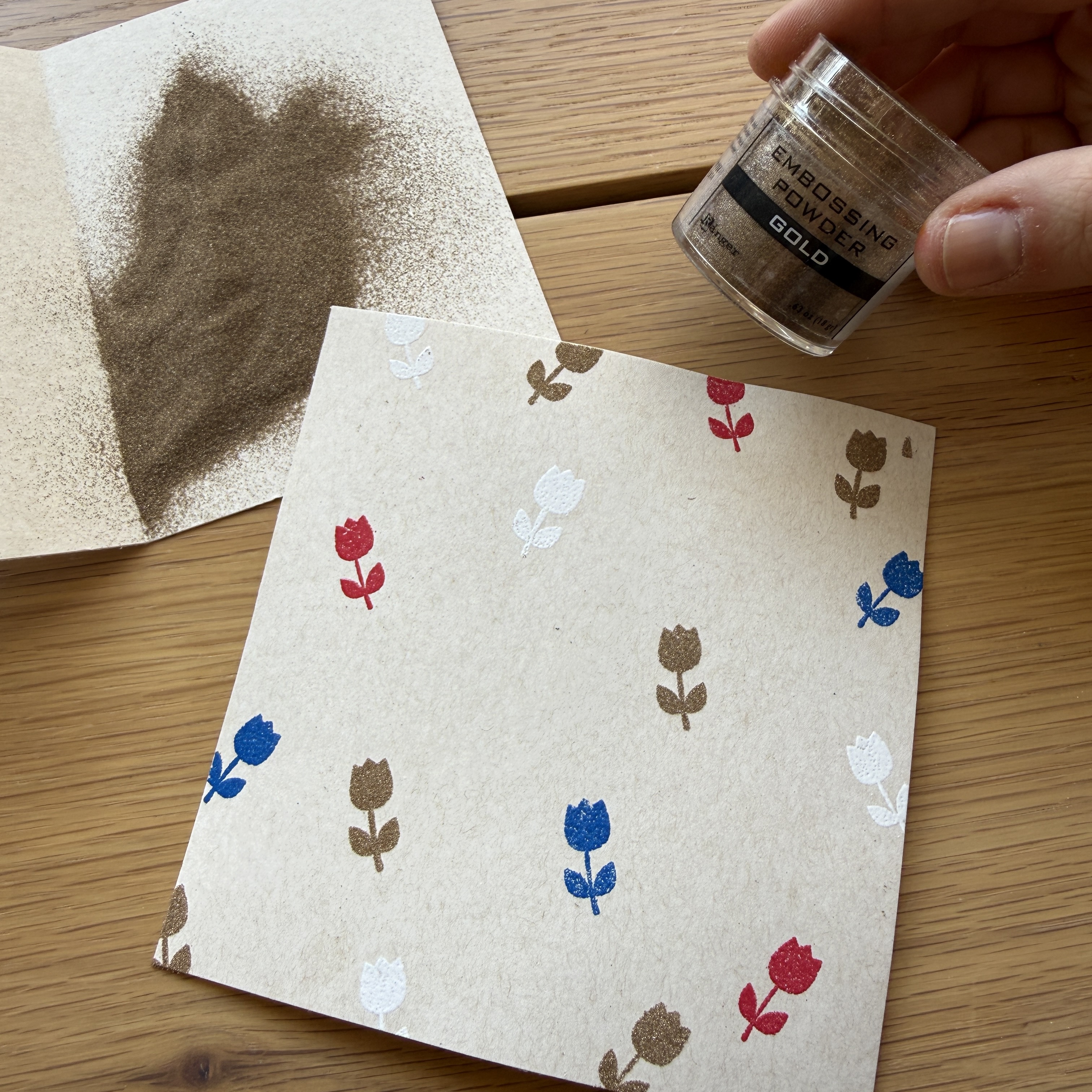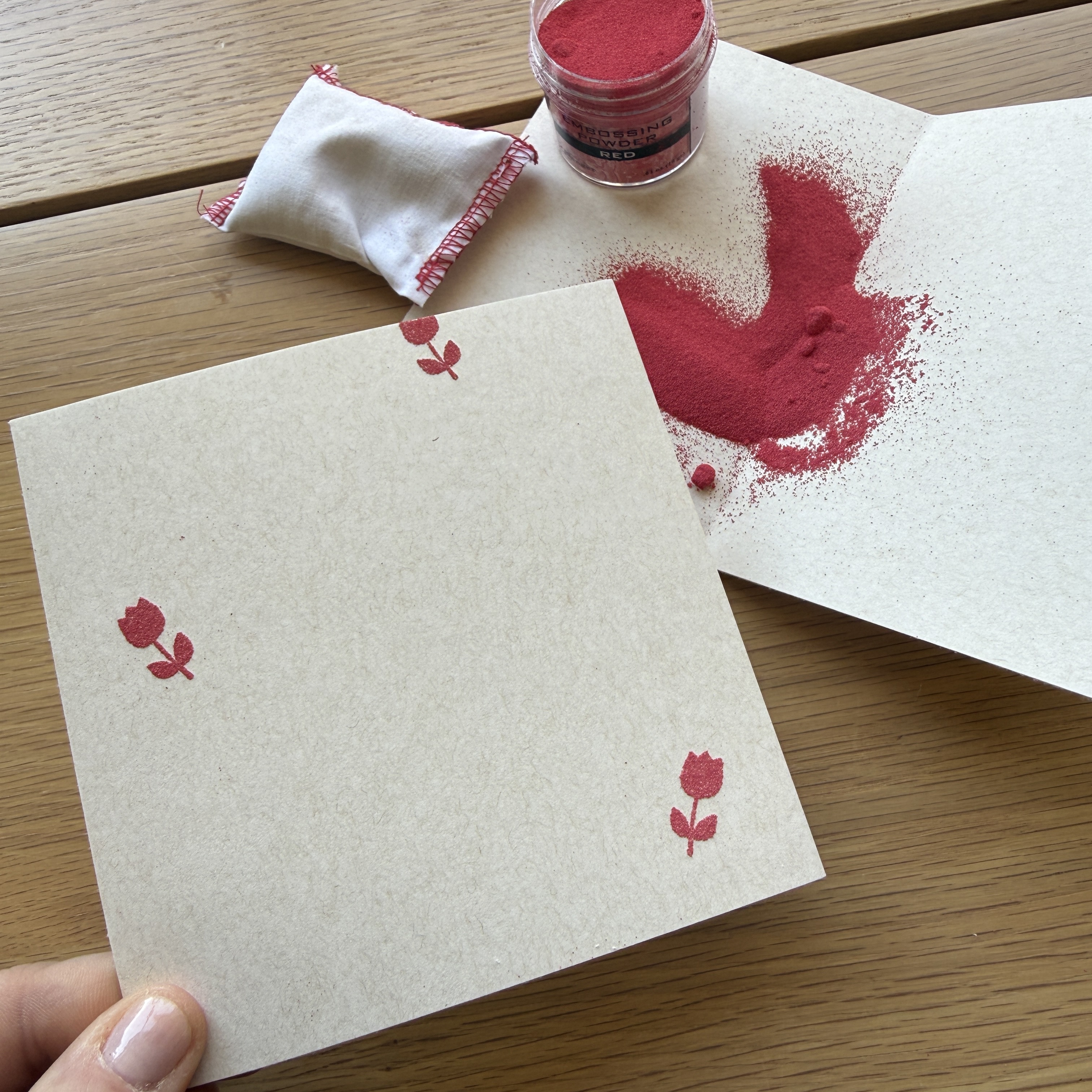 Frota la cartulina kraft clara con una bolsita antiestática. Después, estampa tulipanes con Versamark. Espolvorea polvo de embossing rojo por encima y caliéntalo con una herramienta de calor hasta que se funda.