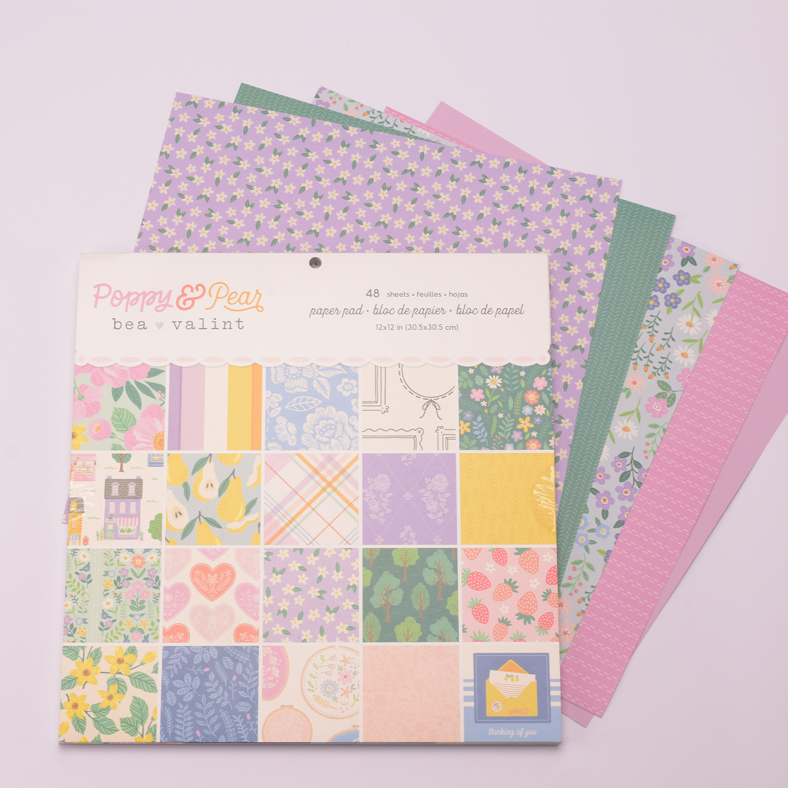 Prenez le bloc de papier American Crafts Poppy & Pear et choisissez quelques jolis motifs. Préparez également une feuille de cardstock lilas.