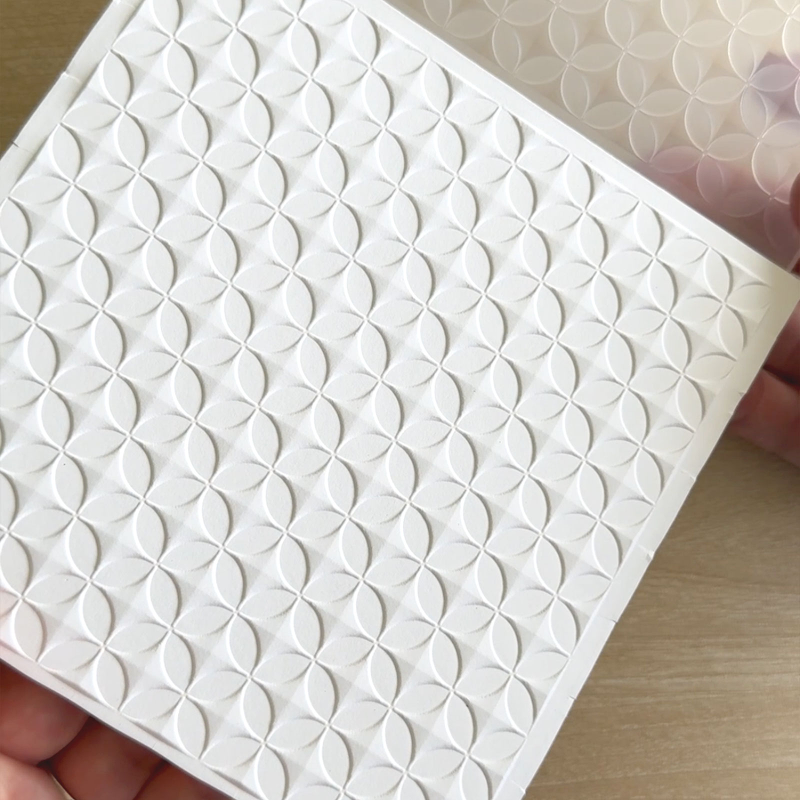 Prenez une carte double blanche de 15,5 x 15,5 cm. Collez d’abord le papier pailleté, puis le papier embossé.