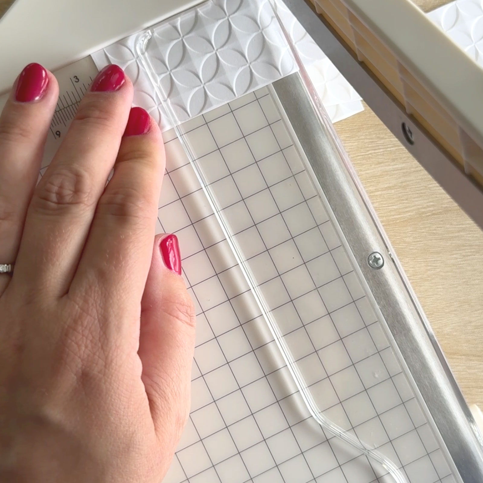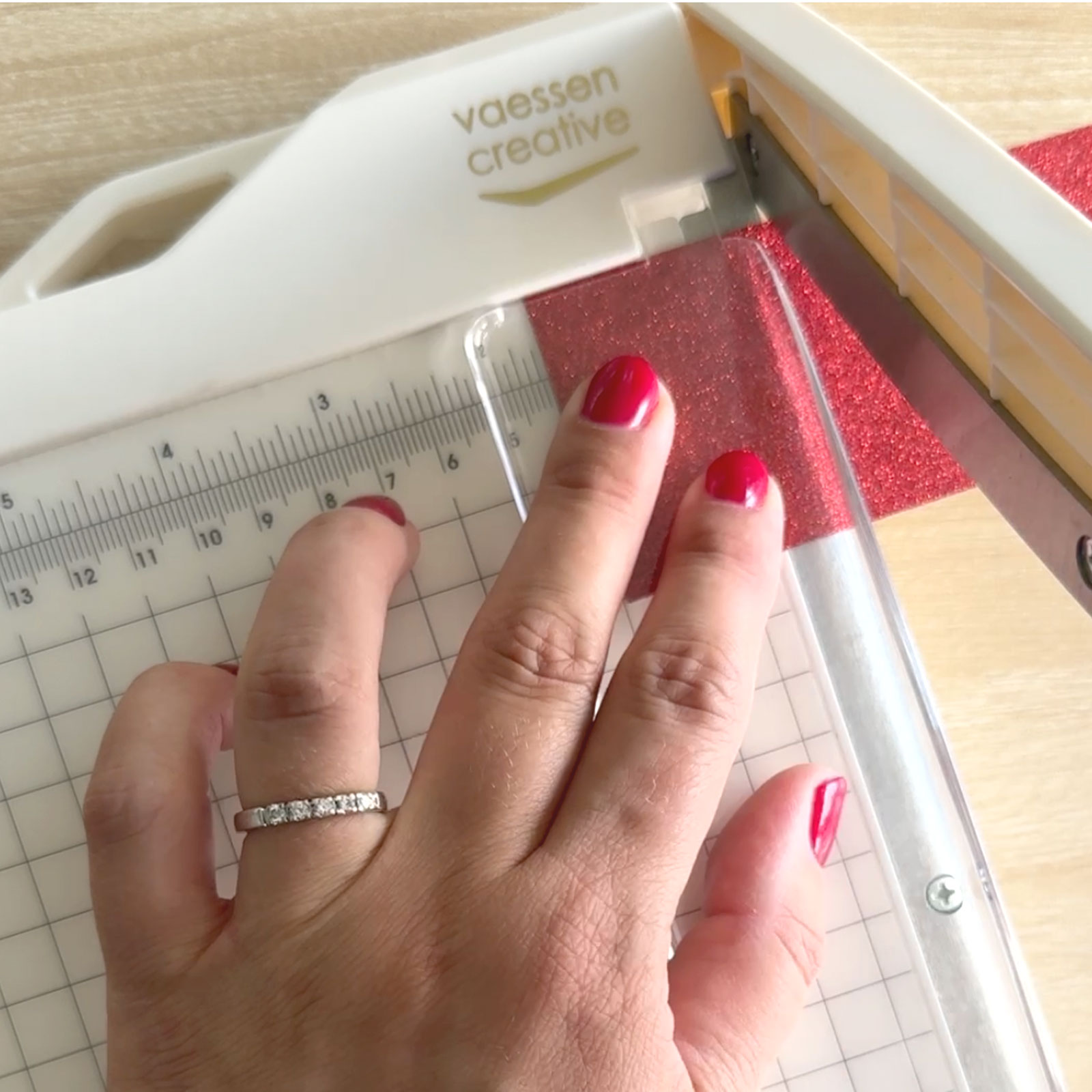 Découpez ensuite le papier embossé à 14,5 x 14,5 cm. Prenez une feuille de papier pailleté rouge et découpez-la à 15 x 15 cm.