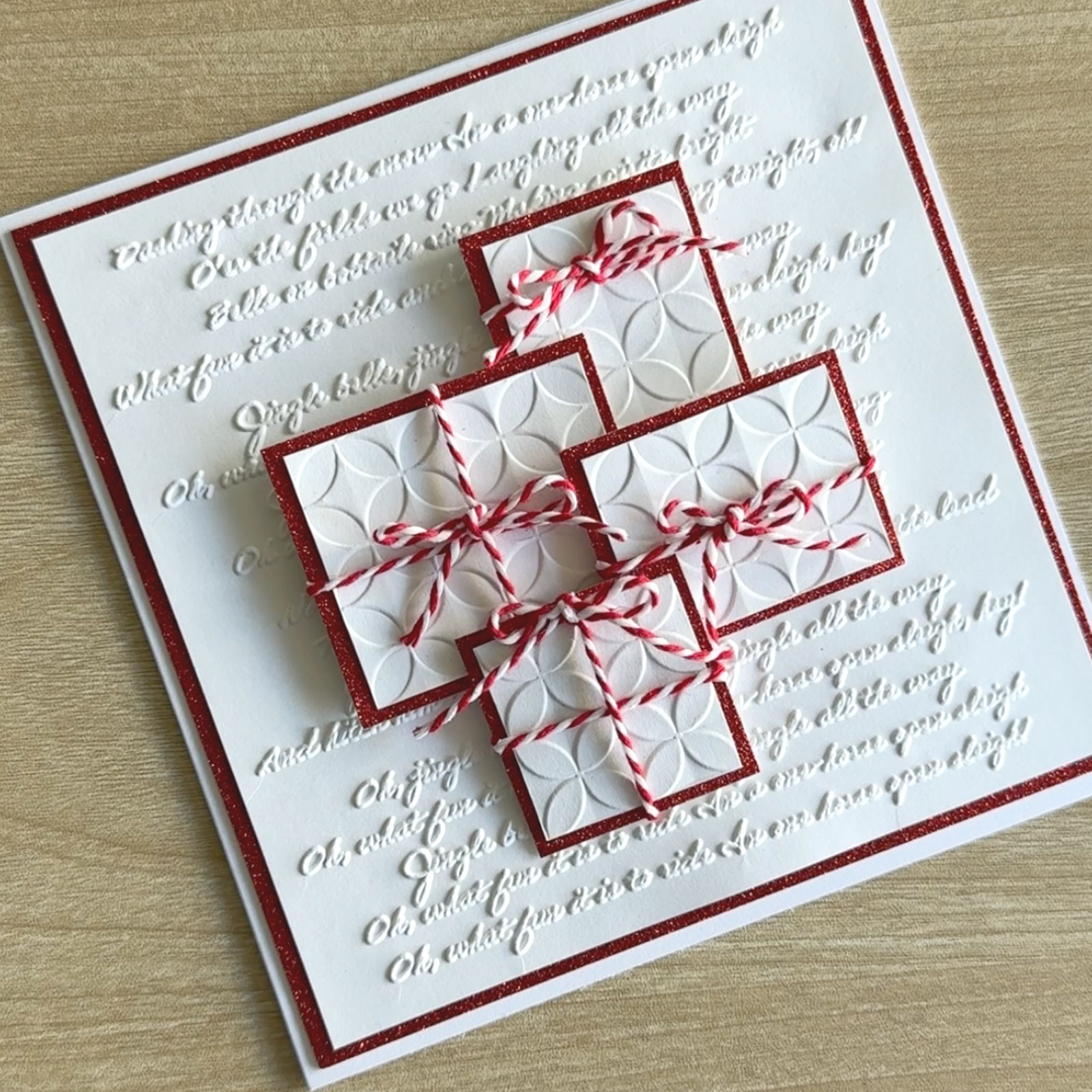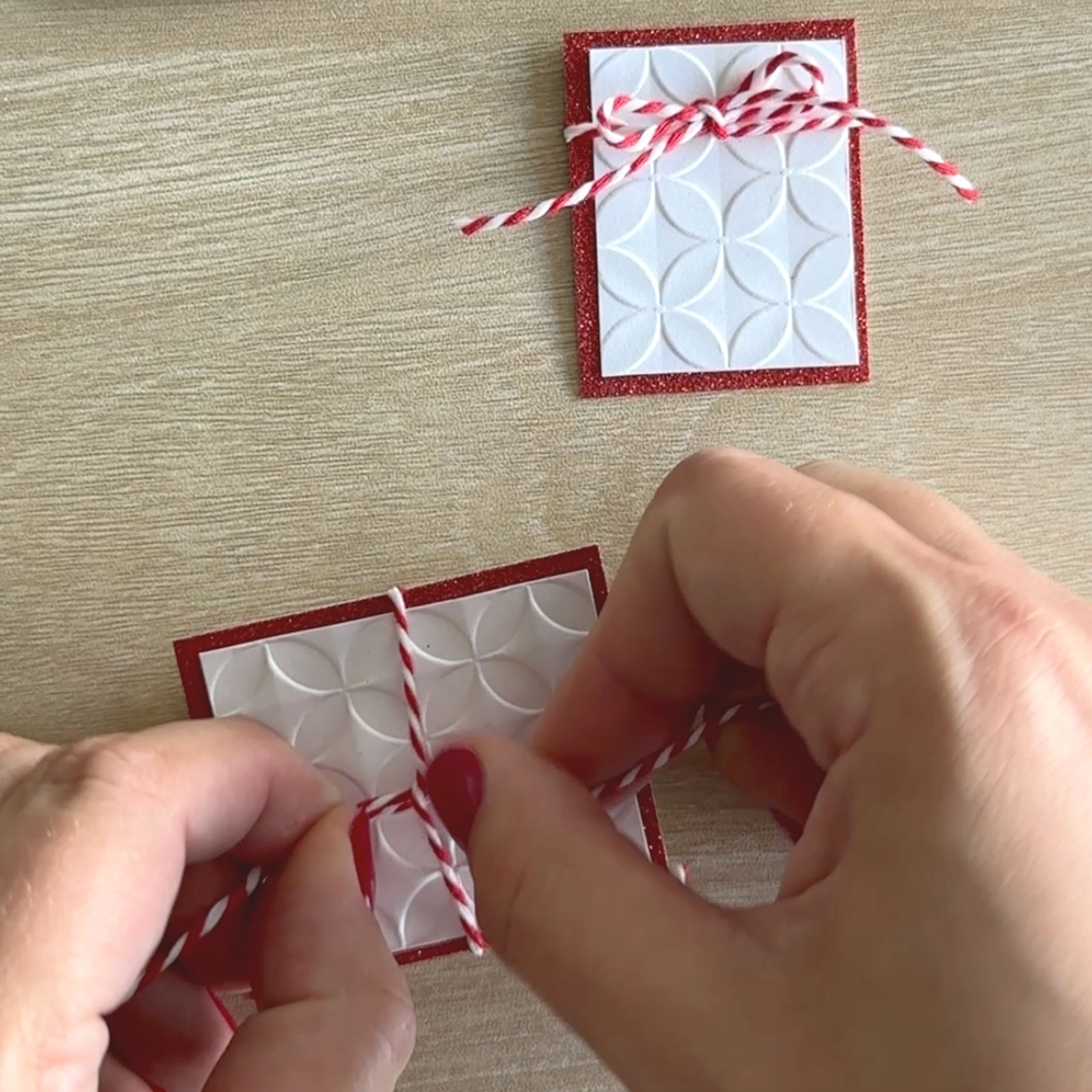 Collez les carrés et rectangles blancs embossés sur les rouges. Transformez-les en cadeaux en ajoutant des petits nœuds réalisés avec de la ficelle rouge et blanche.