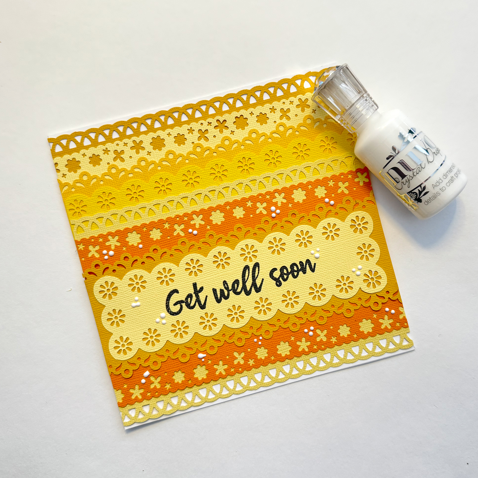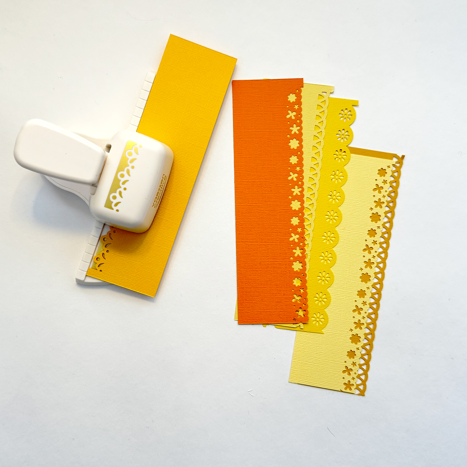 Envie d’une idée originale pour la création de cartes ? Grâce aux perforatrices de bordure et aux différentes nuances de papier jaune, vous créez des motifs lumineux et modernes. Cette carte de rétablissement faite main apportera sans aucun doute du réconfort.