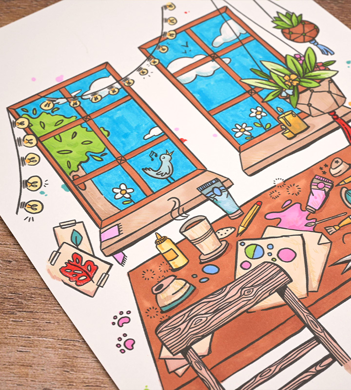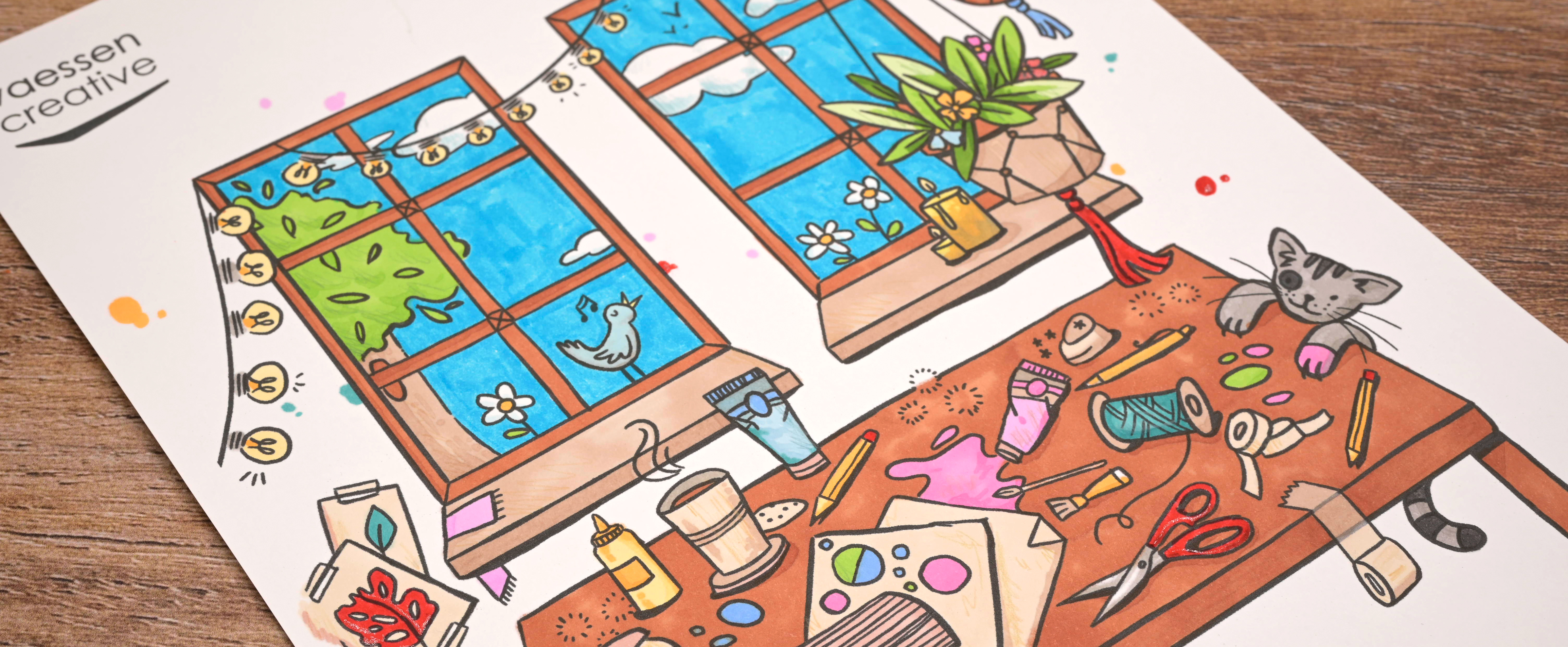 Plongez dans une ambiance chaleureuse et festive avec cette joyeuse page de Noël à colorier ! La table est remplie de peinture, de papier et de décorations prêtes à être colorées. Donnez vie à la scène en coloriant le sapin, les cadeaux et la vue cosy depuis la fenêtre. Une page parfaite pour tous ceux qui aiment Noël et les moments créatifs.