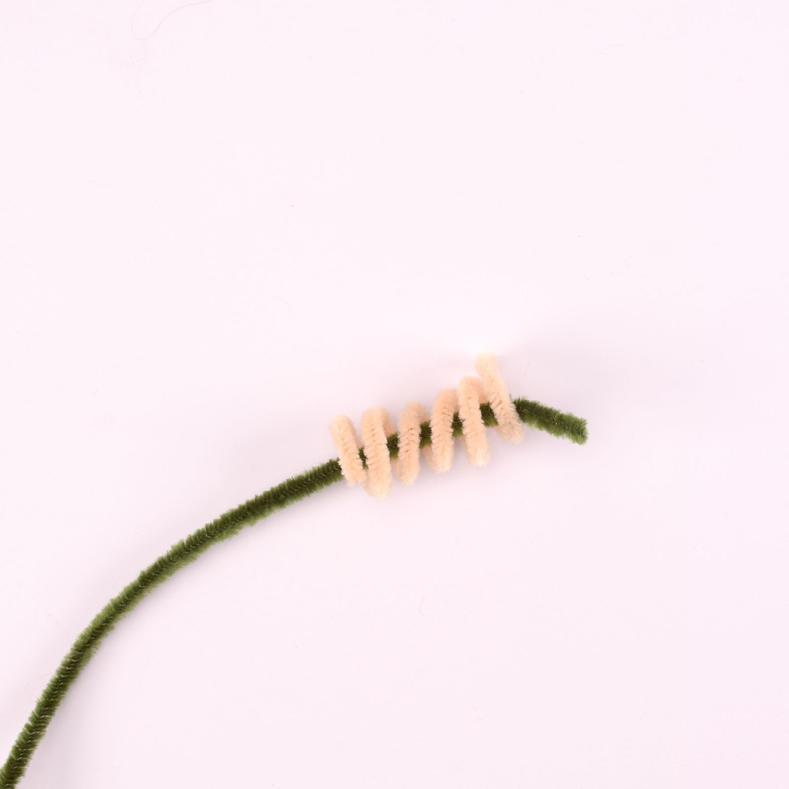 Fleur B : Faites une petite boucle avec le fil vert et enroulez-la fermement autour de la tige de la fleur. Les spirales beiges se rejoindront à la base.