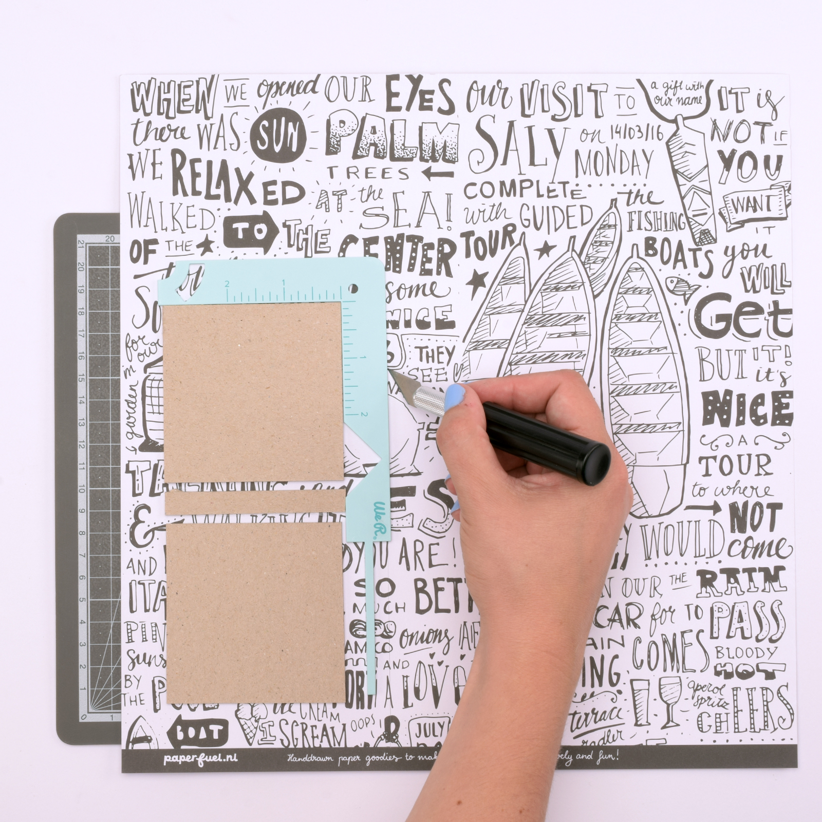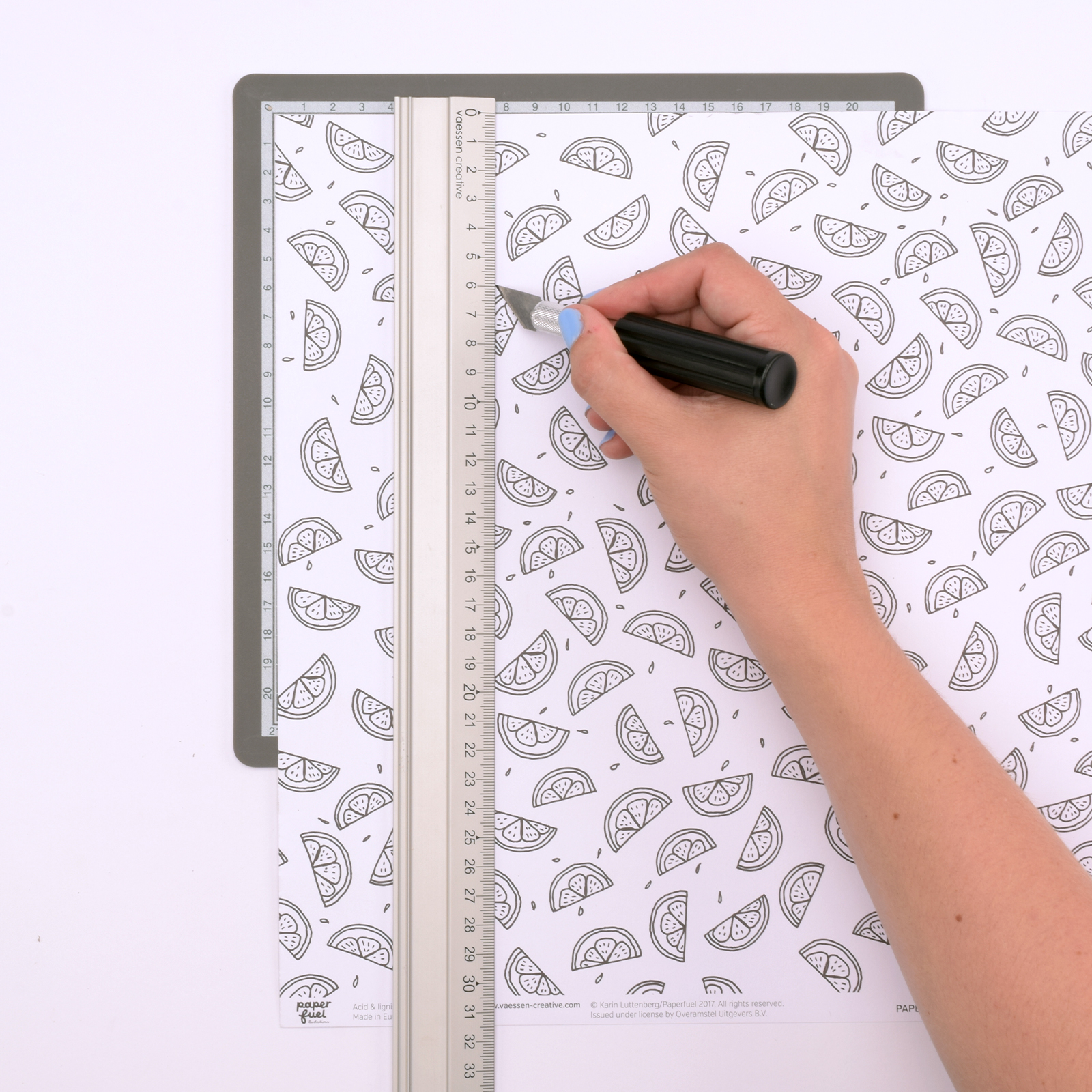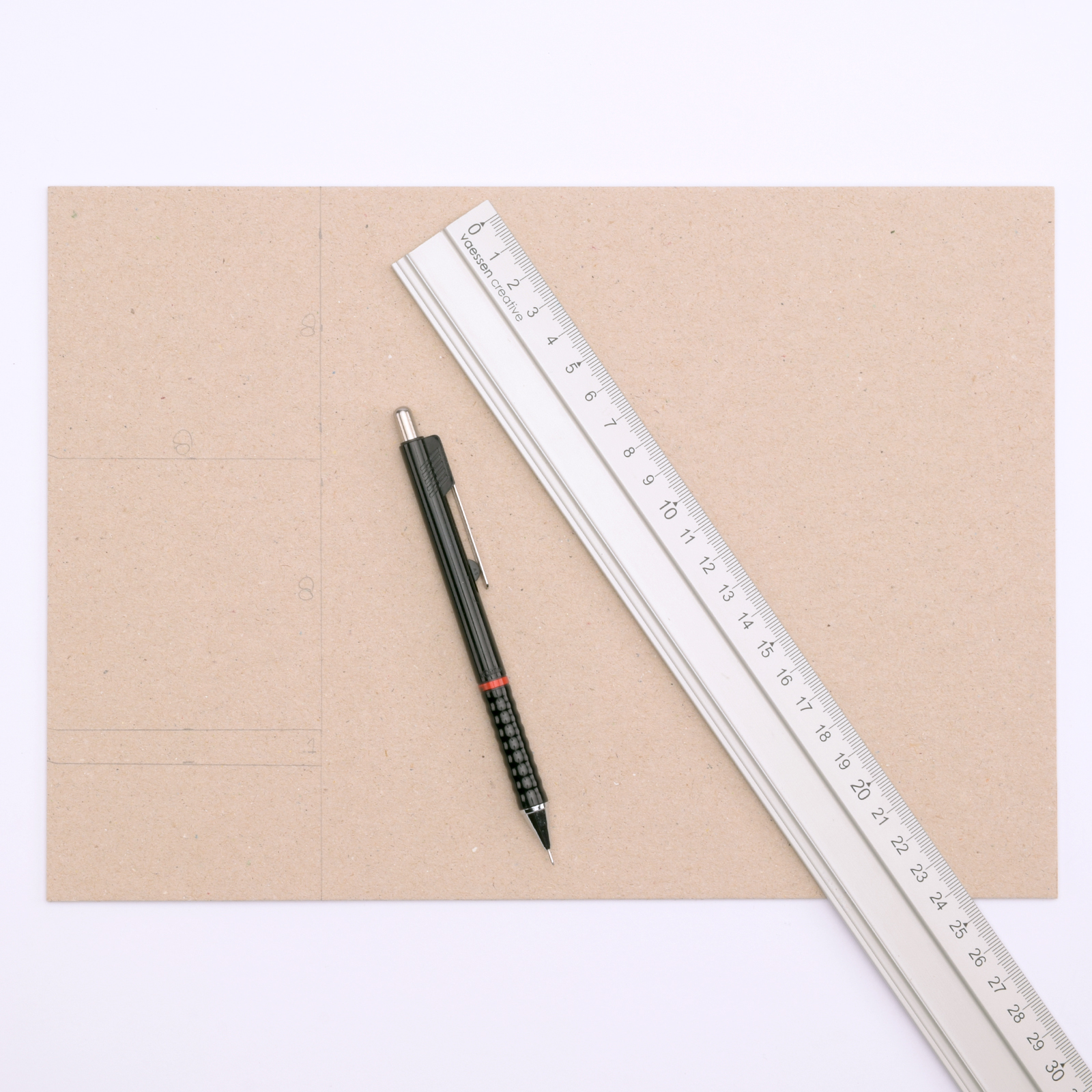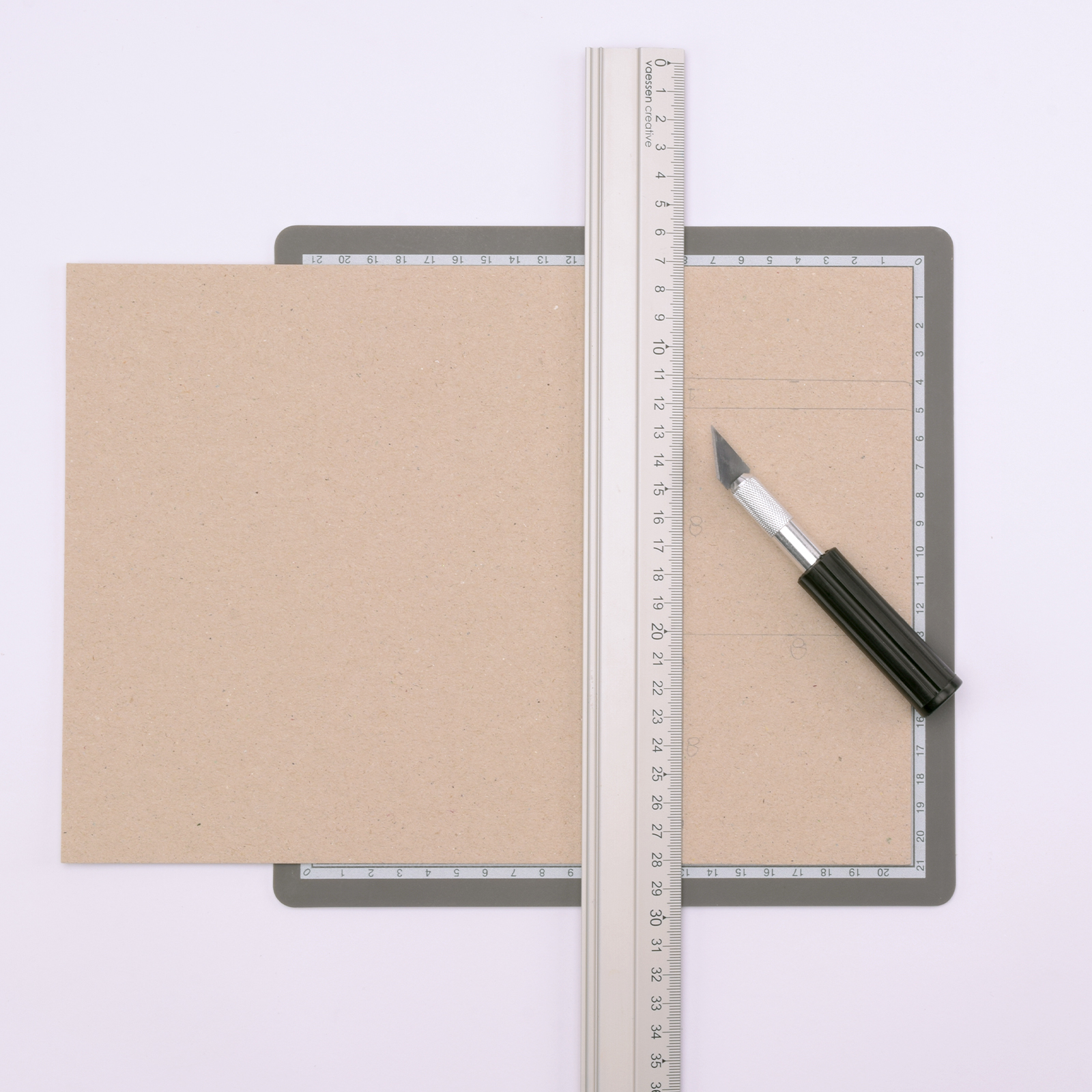 Placez le carton sur un tapis de découpe et, à l’aide d’une règle en aluminium et d’un cutter, découpez les formes.