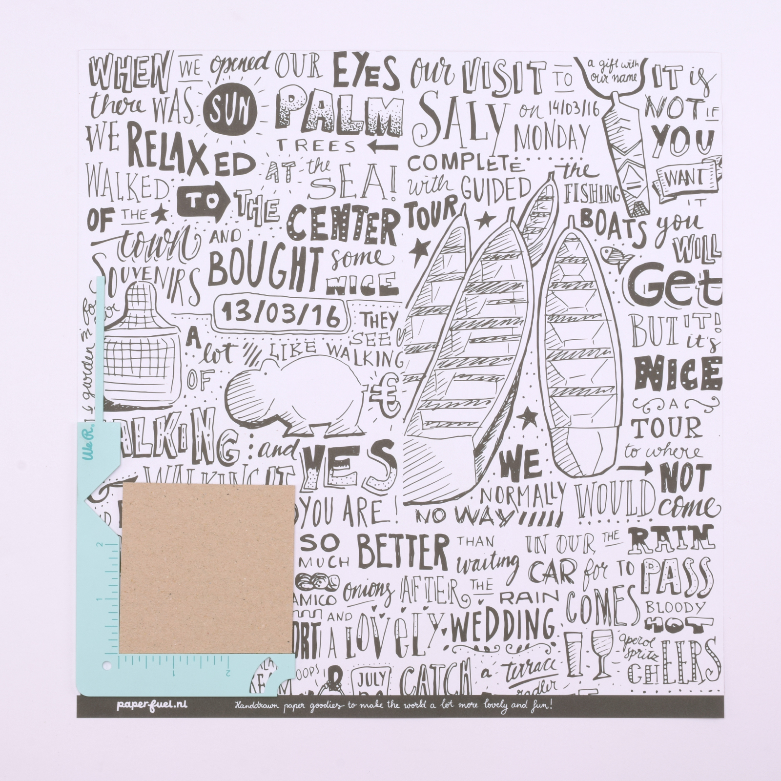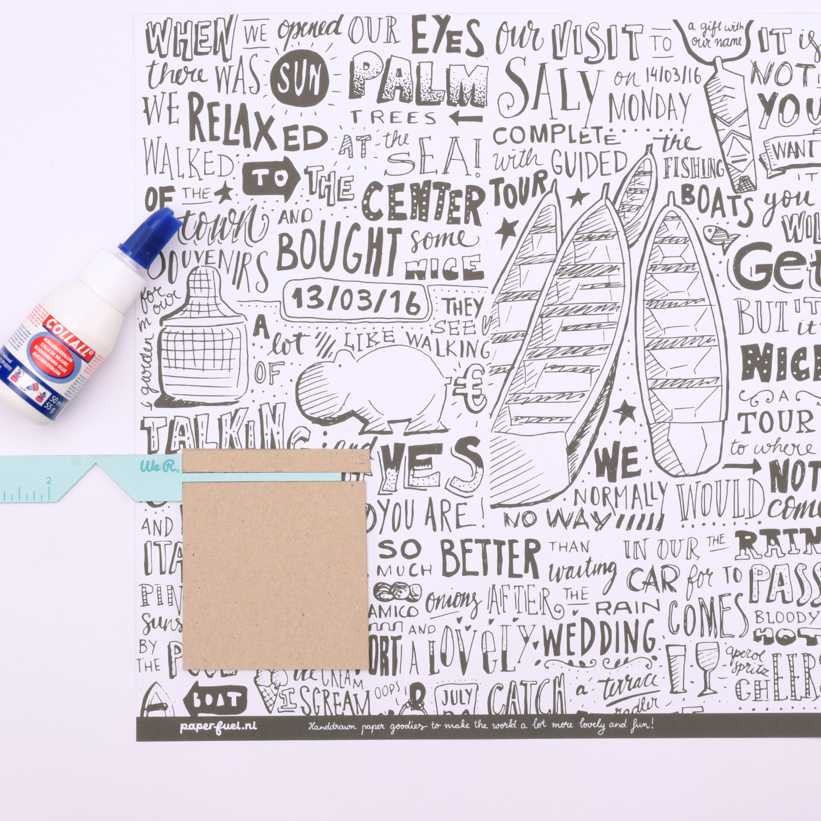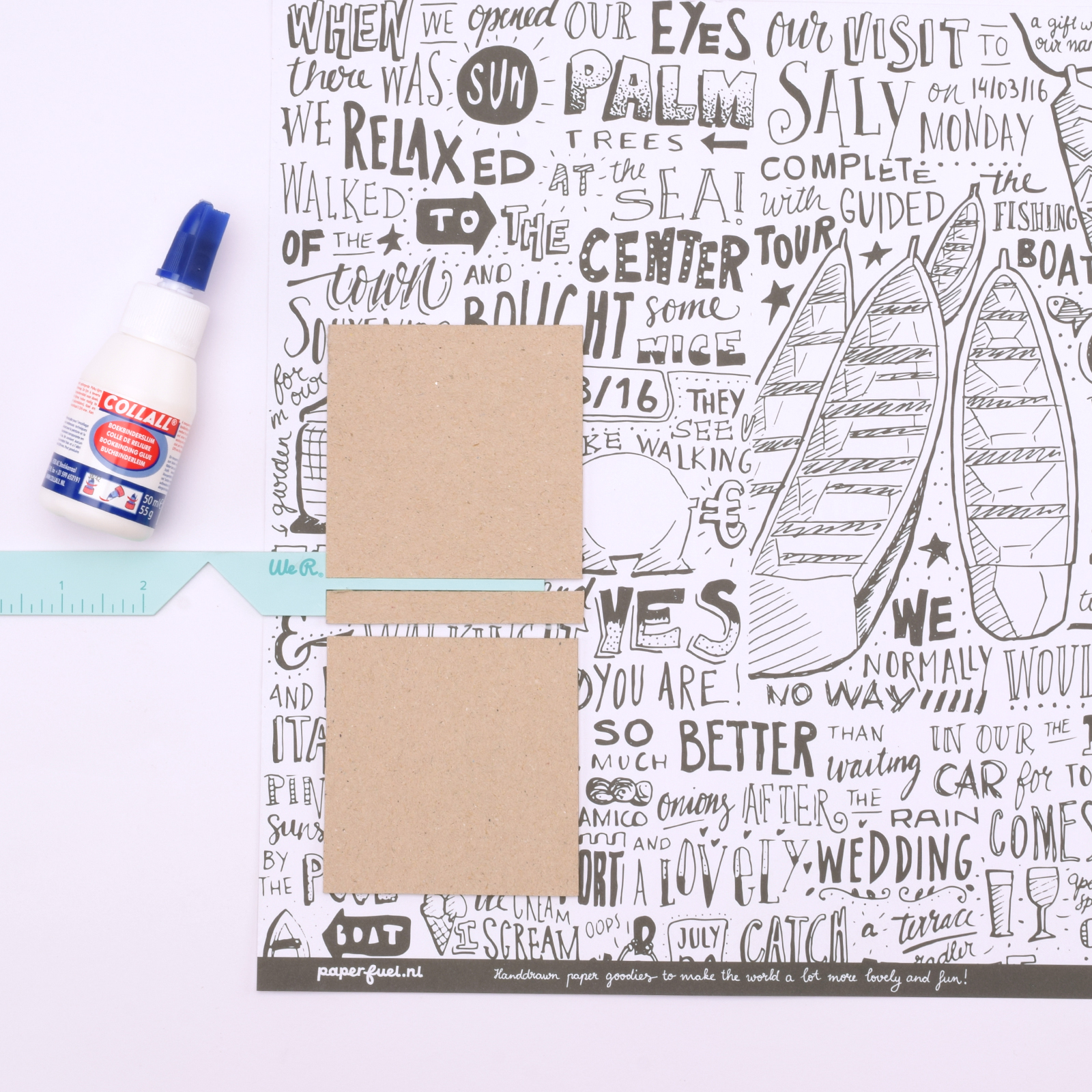 Prenez une feuille de papier scrap et placez la We R Makers Book Cover Guide dans un angle. Posez dessus le carton de 8 x 8 cm et collez-le avec de la colle pour reliure.