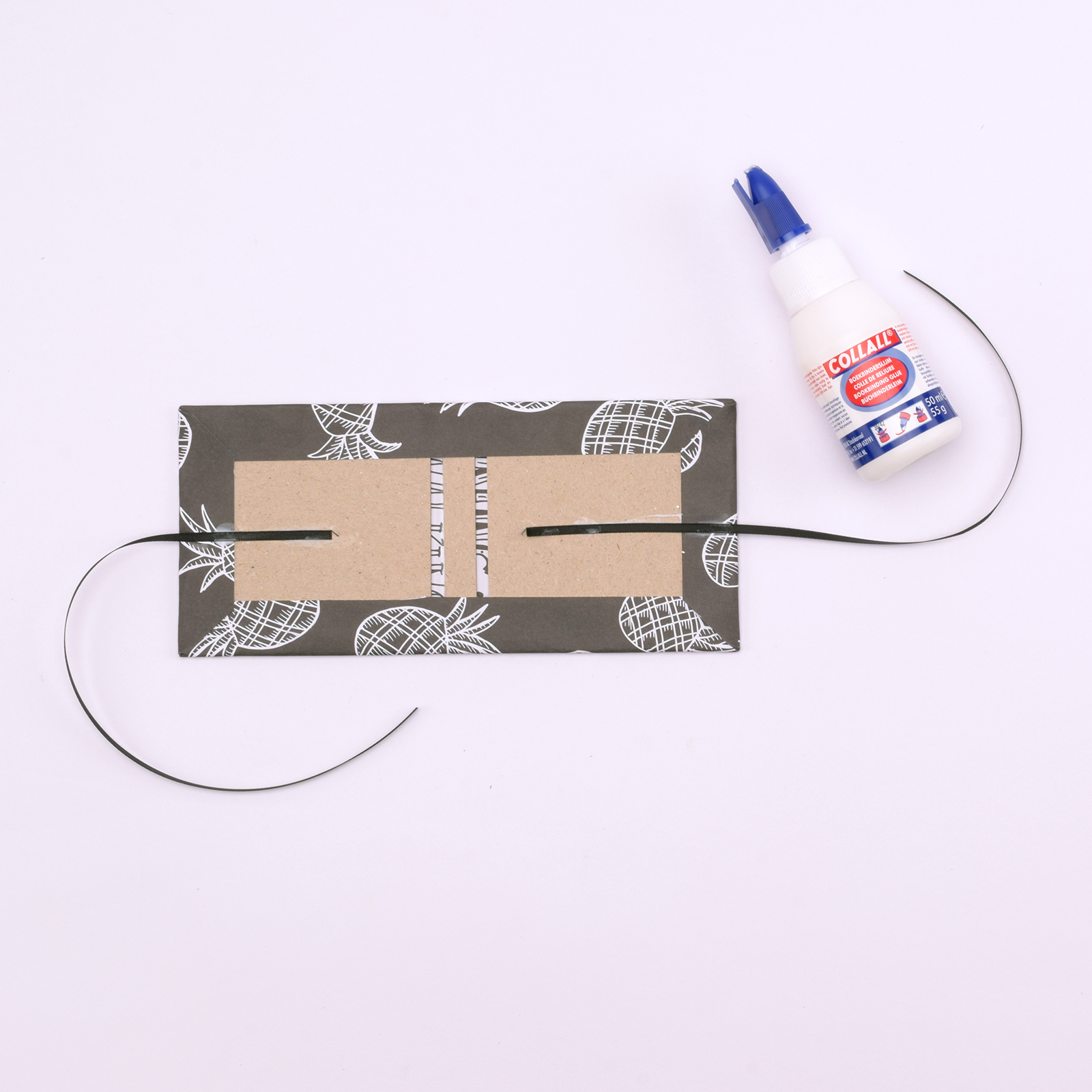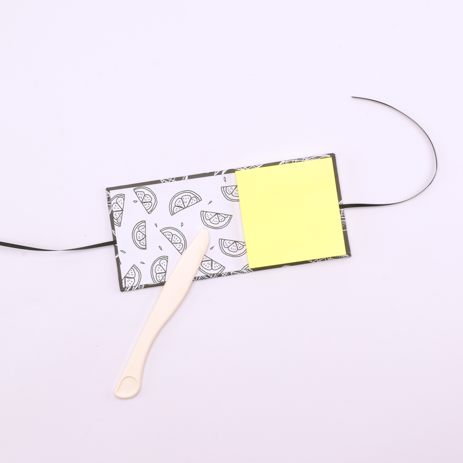 Collez ce rectangle sur le carton et les rubans. Marquez bien les plis puis fixez un bloc de Post-It.