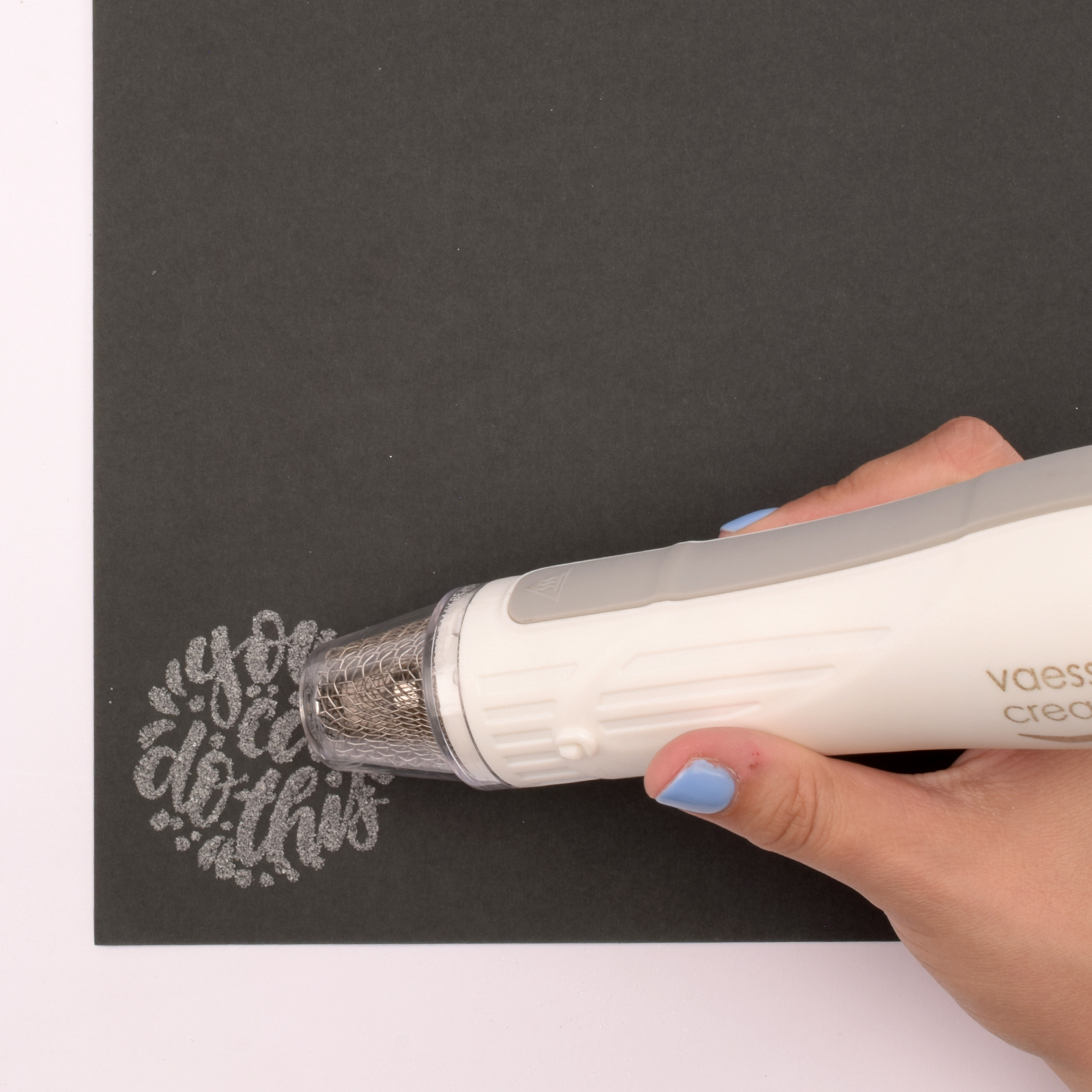 Saupoudrez le texte de poudre à embosser transparente et chauffez-le avec un heat tool jusqu’à ce que la poudre soit fondue.