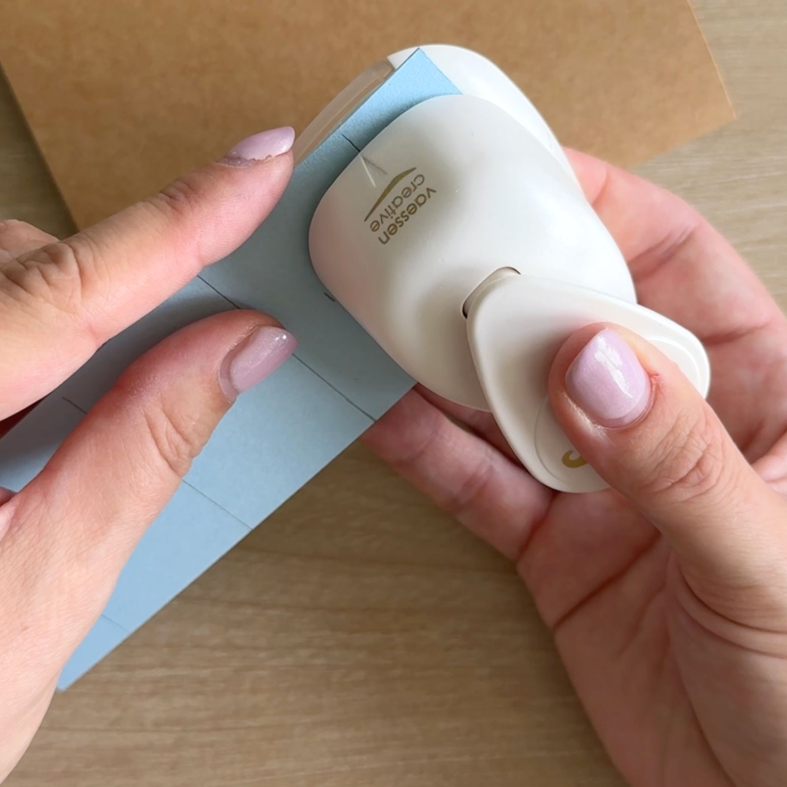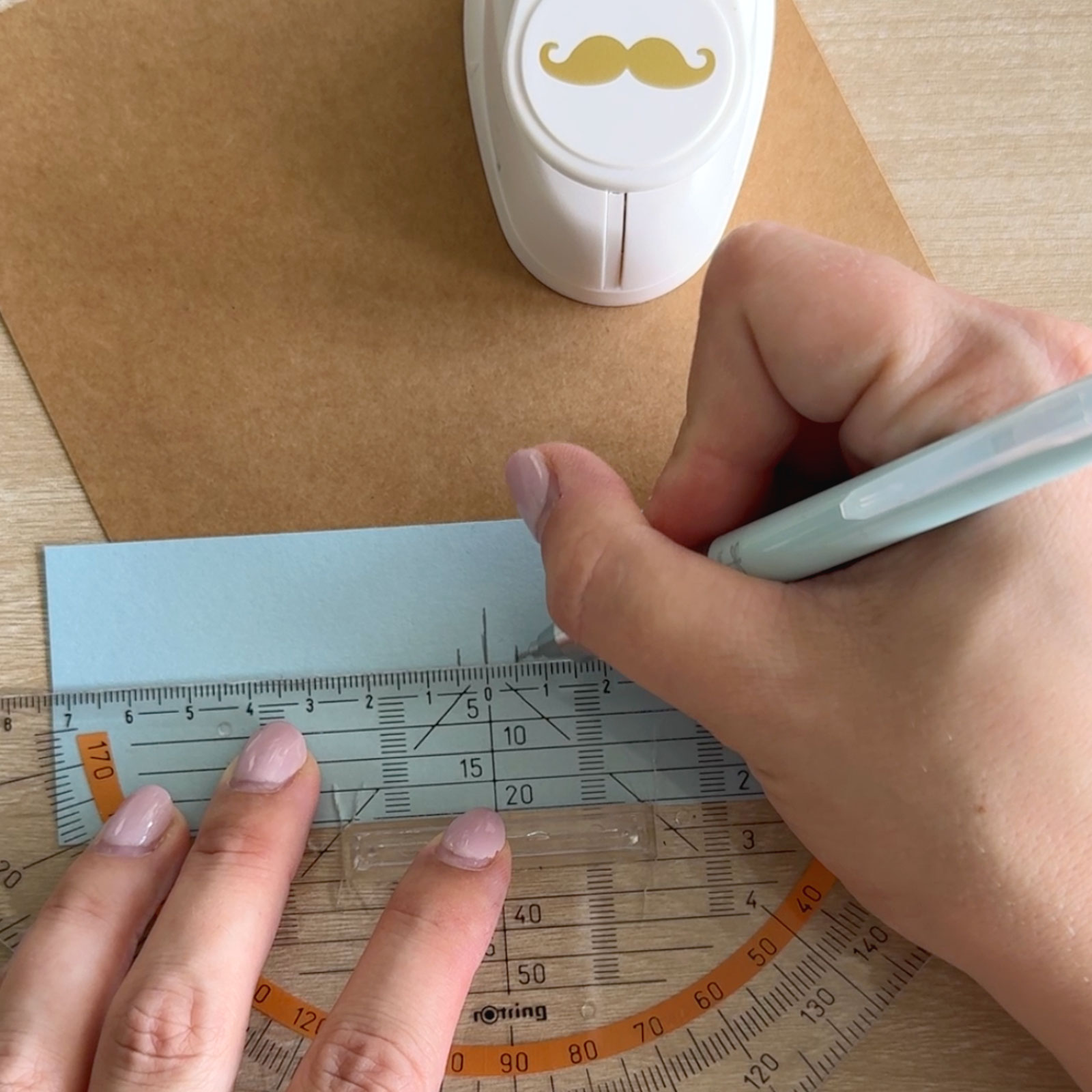 Pour cette carte, nous allons fabriquer un petit pochoir avec la perforatrice moustache. Découpez une bande de papier de 14,5 x 4 cm. Marquez le centre et tracez un trait à 0,5 cm de chaque côté.