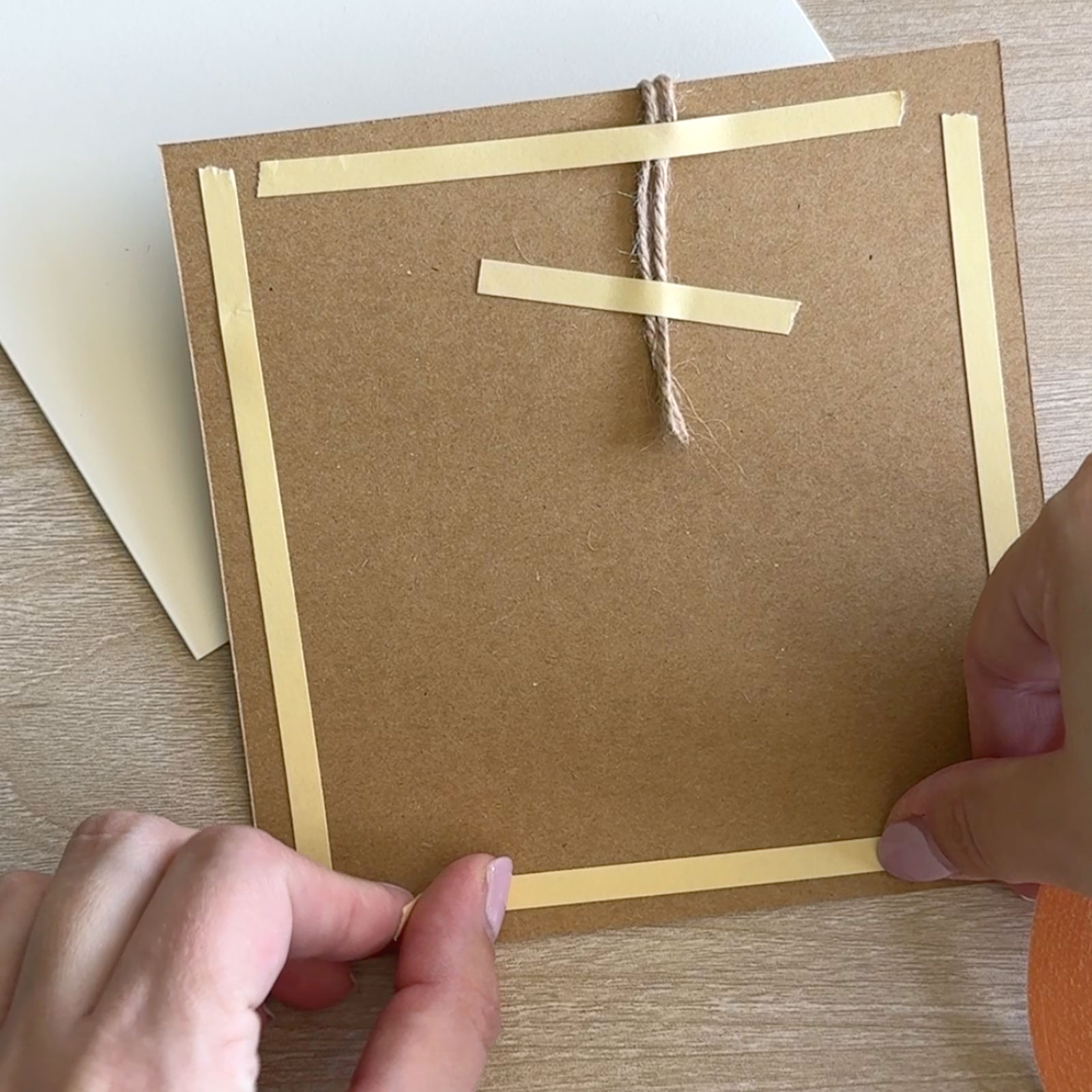 Fixez la ficelle à l’arrière. Enfin, collez la carte décorée sur une carte de base pliée de 15,5 x 15,5 cm avec du ruban adhésif double face.