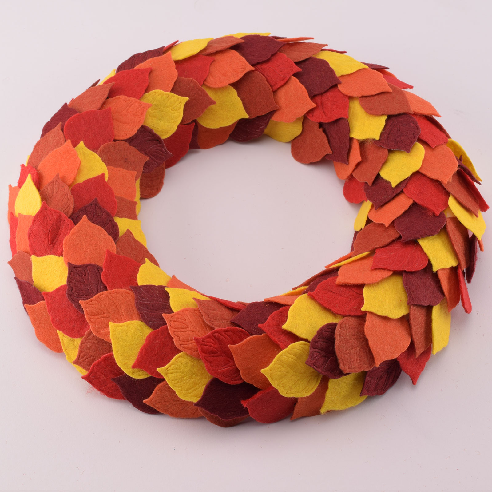 Réalisez une couronne d’automne chaleureuse avec des feuilles en feutrine aux couleurs naturelles. Ce DIY est parfait pour les créations d’automne et transforme un anneau en polystyrène en jolie décoration saisonnière.