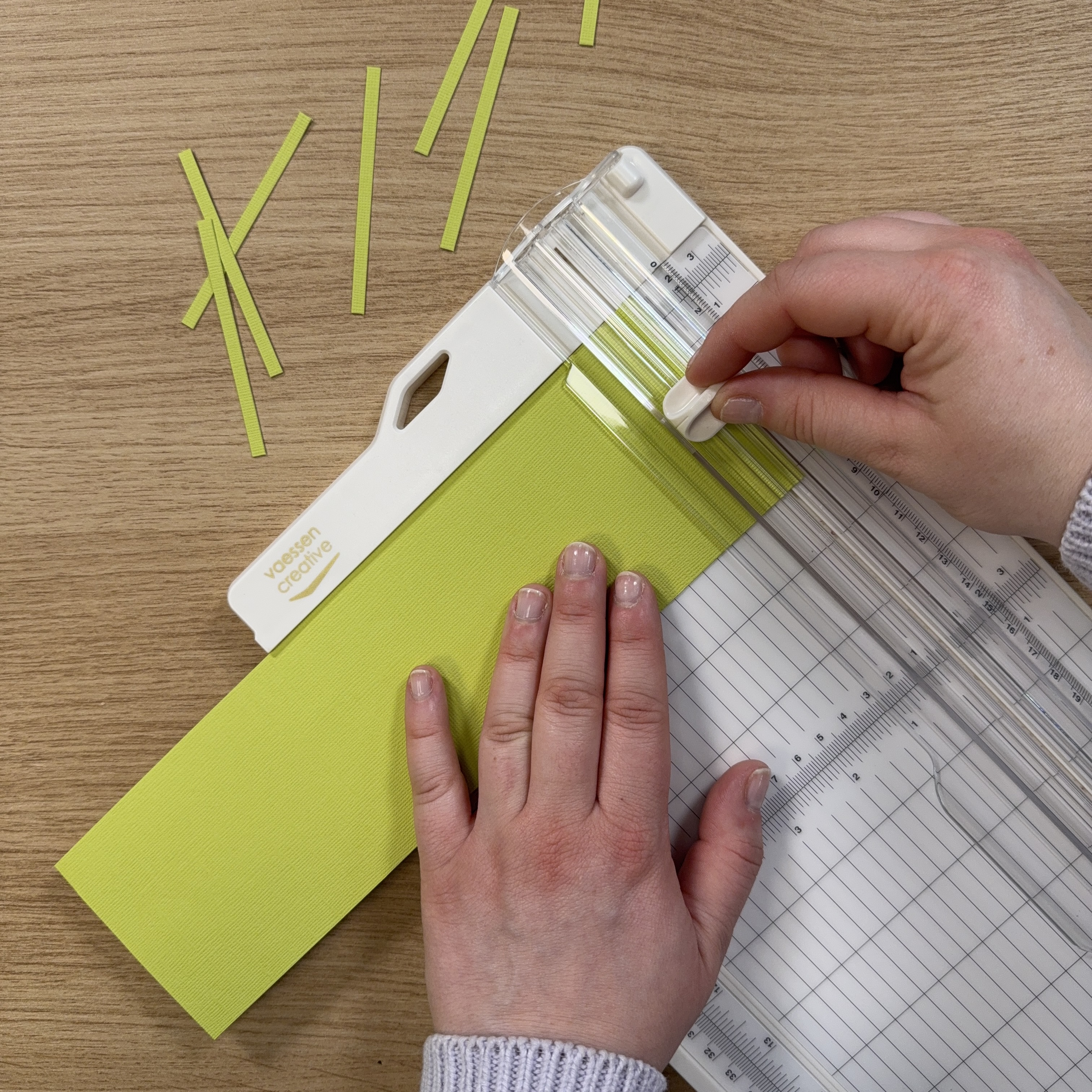 Taglia delle striscioline verdi di 0,5 x 8 cm.