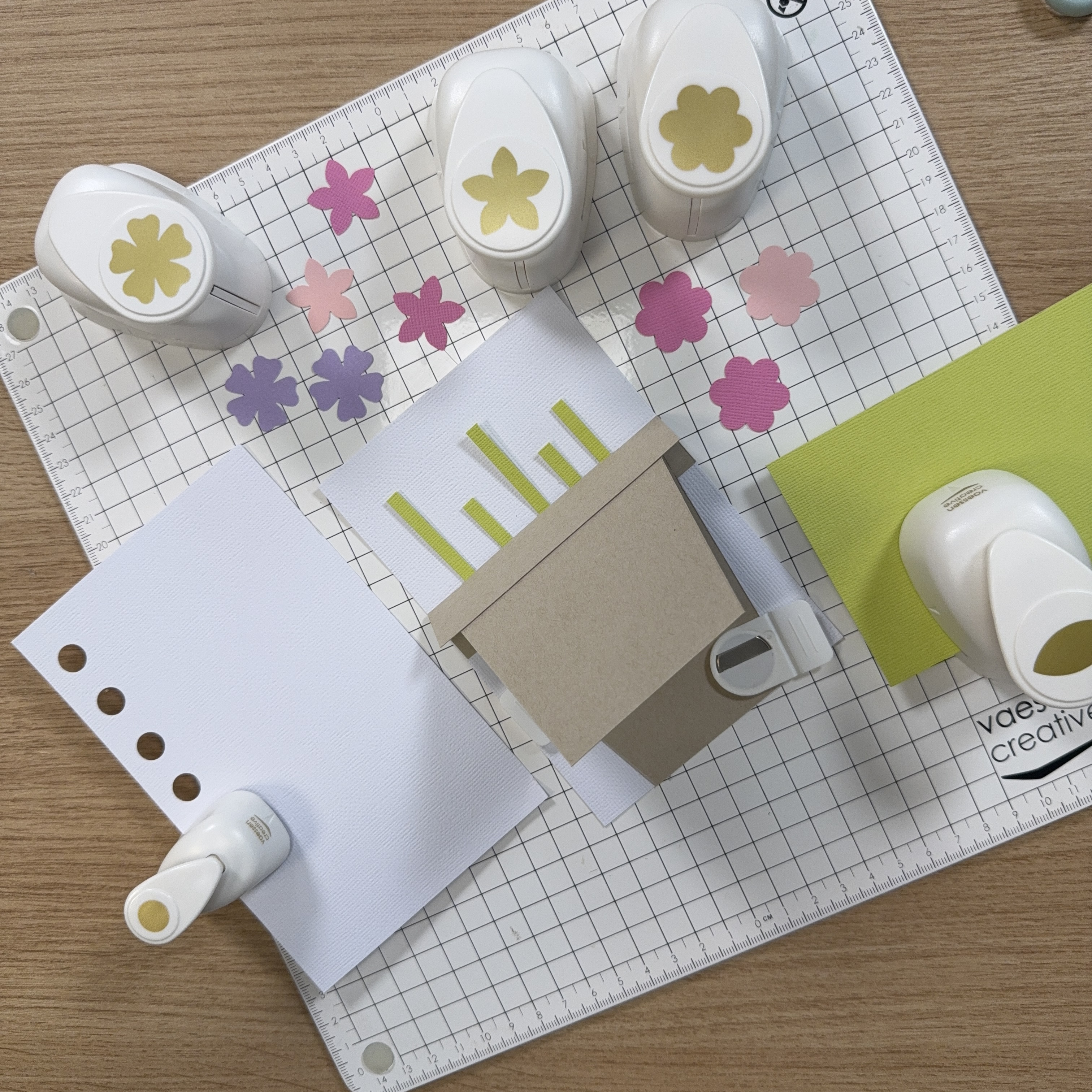 Fustella dei fiori da cartoncino rosa e viola. Fustella anche delle foglie da cartoncino verde e dei cerchi da cartoncino bianco.