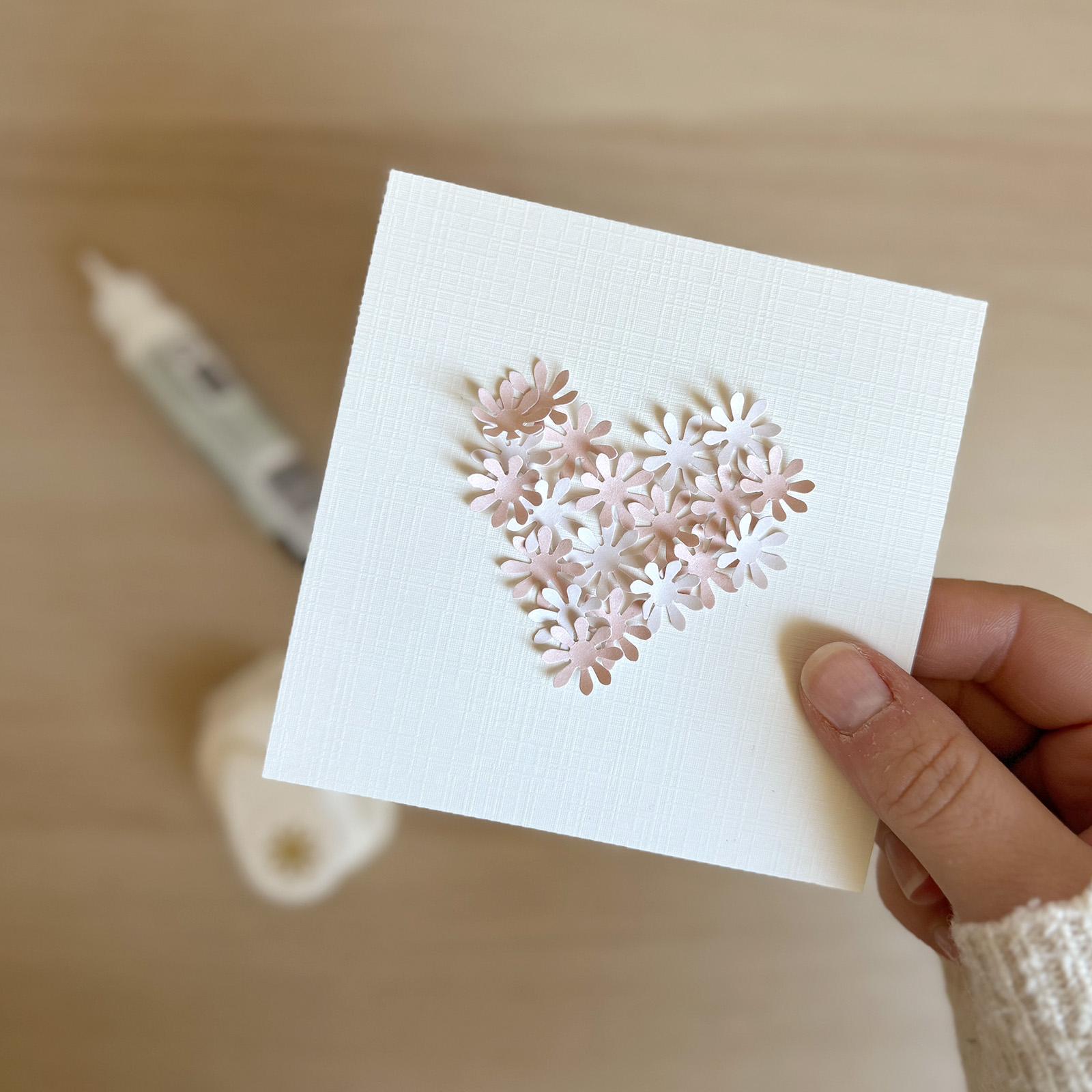 Vuoi creare un biglietto di nozze romantico con un aspetto elegante? In questo progetto creativo realizzerai un biglietto con un cuore di fiori di carta e dettagli delicati. È un’idea splendida per chi ama creare biglietti fatti a mano.