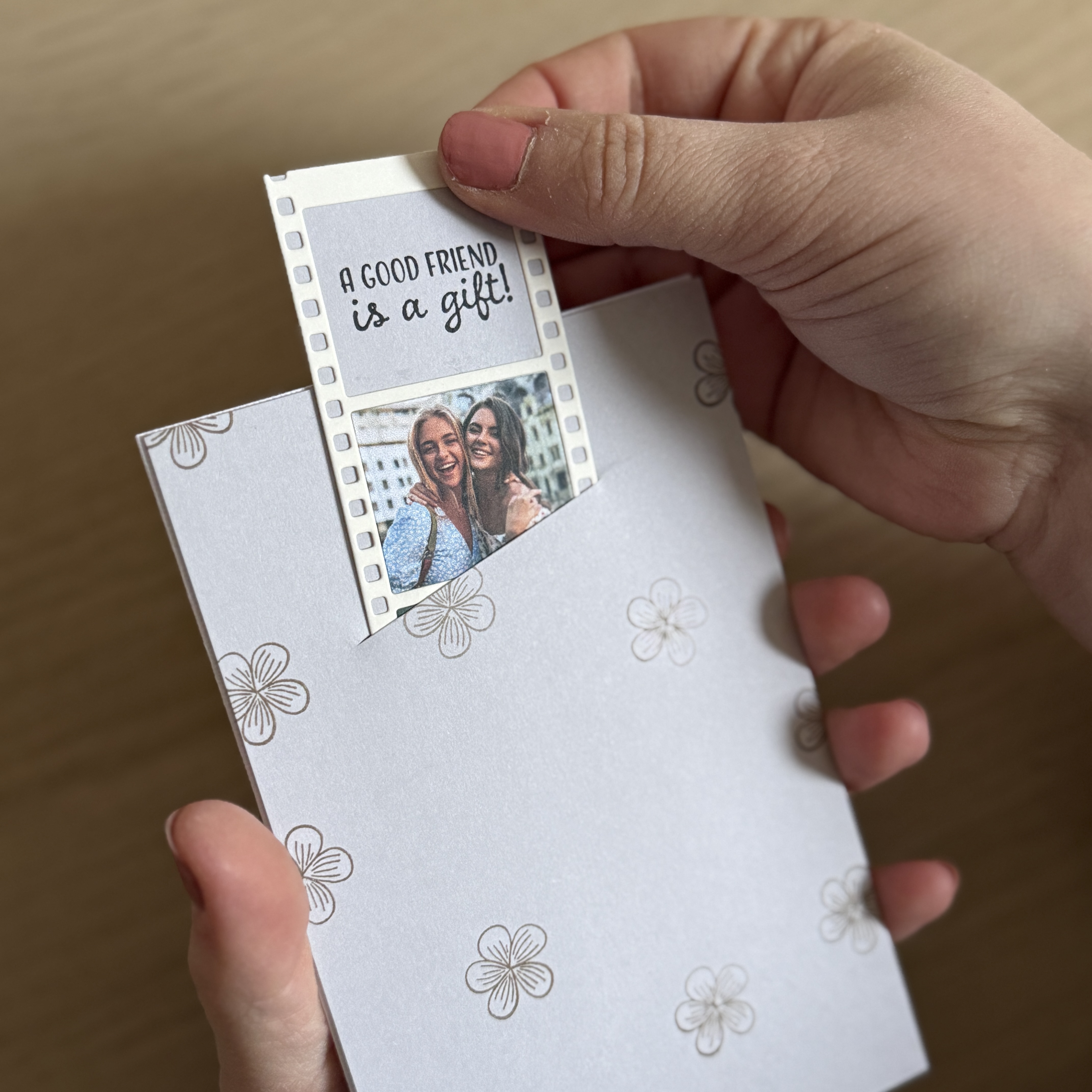 Stampa le tue foto preferite e crea questo biglietto originale con una striscia fotografica estraibile. Perfetto come regalo personale o per sorprendere qualcuno.