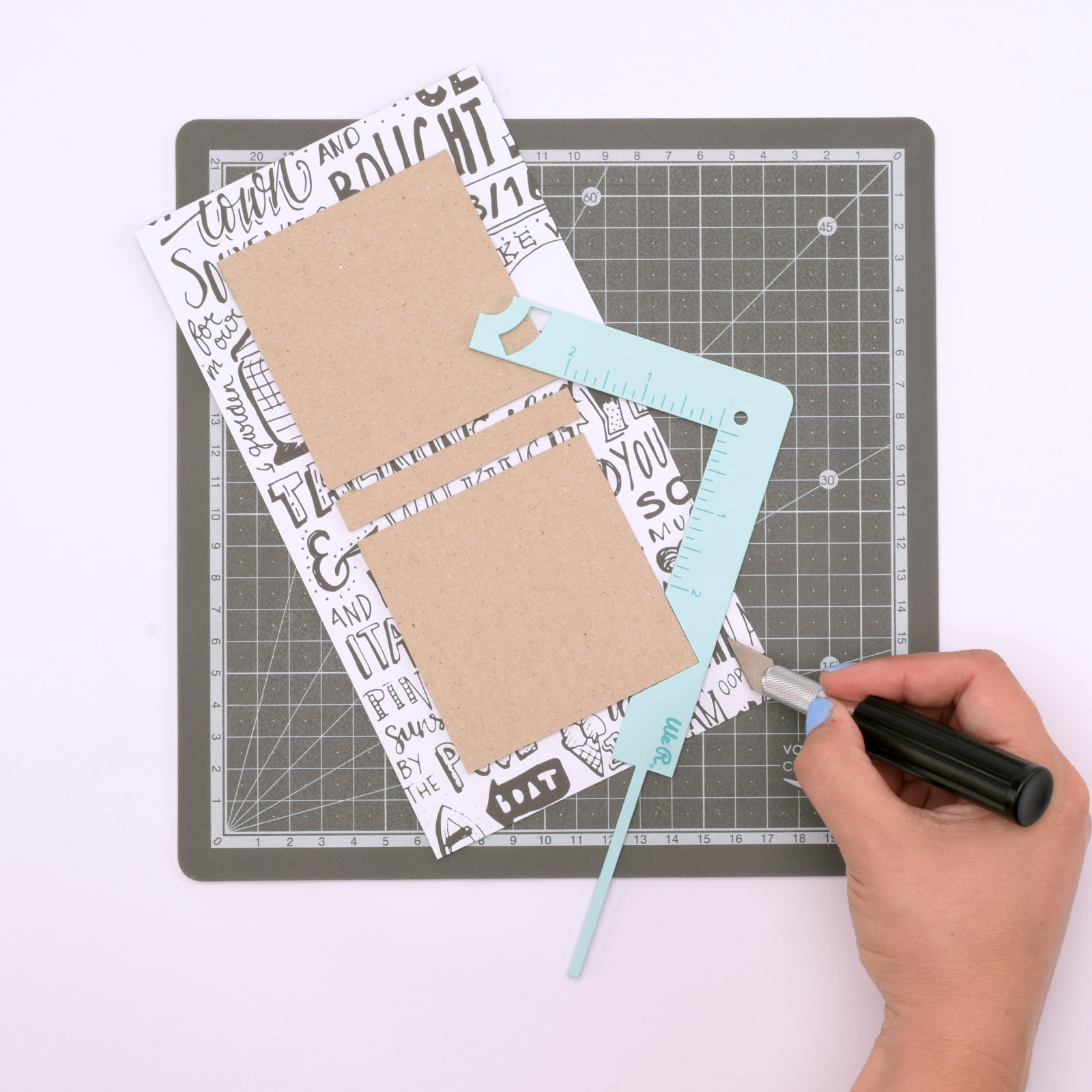 Posiziona il cartoncino su un tappetino da taglio e ritaglia le forme usando un righello in alluminio e un cutter.