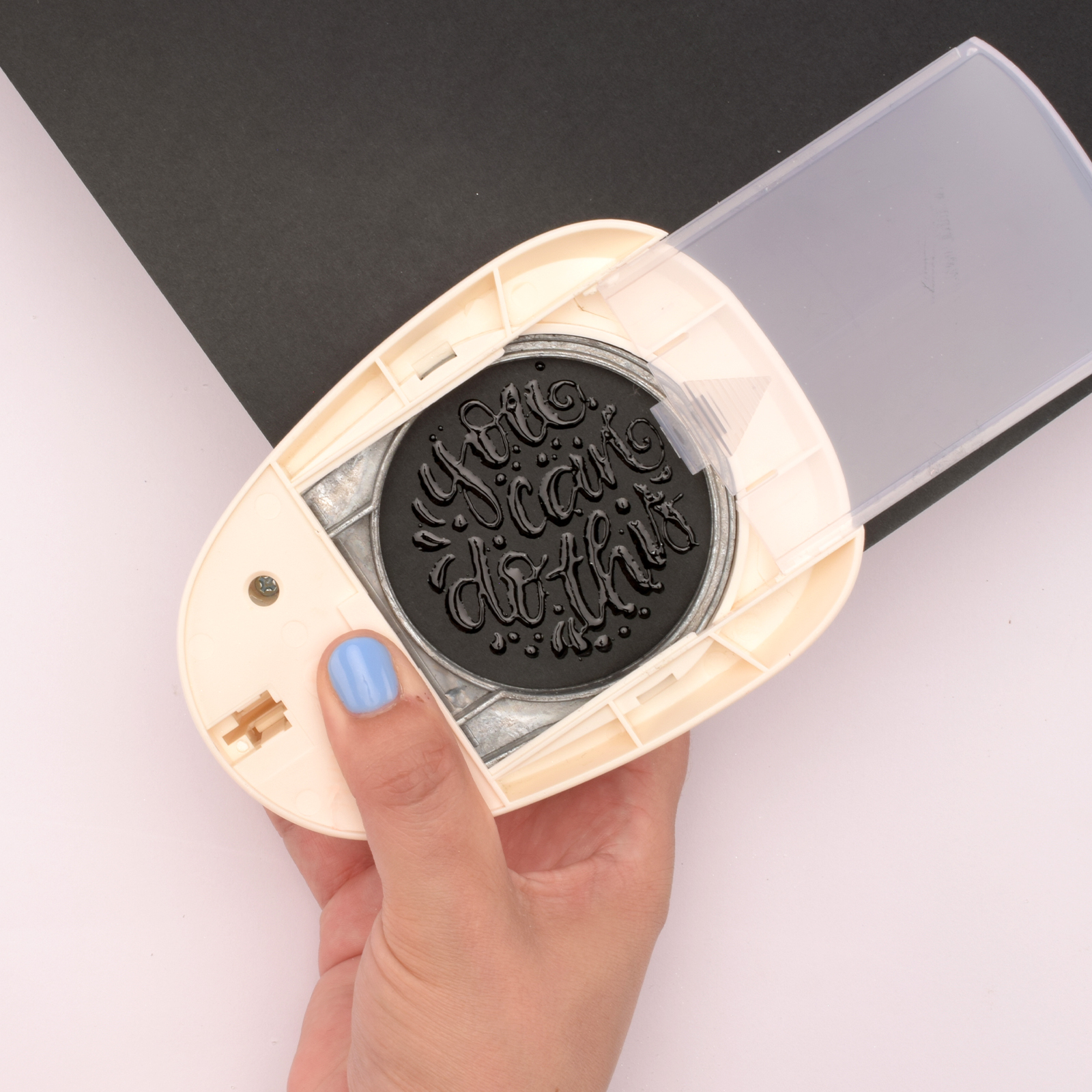 Prendi un foglio di cartoncino nero e timbra un testo carino con inchiostro Versamark.