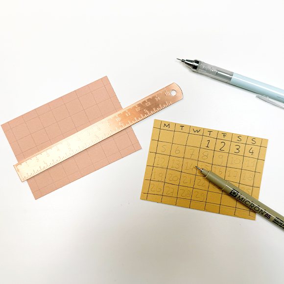 Disegna la griglia del calendario sui fogli piccoli. Puoi prima schizzarla o tracciarla direttamente con un fineliner.