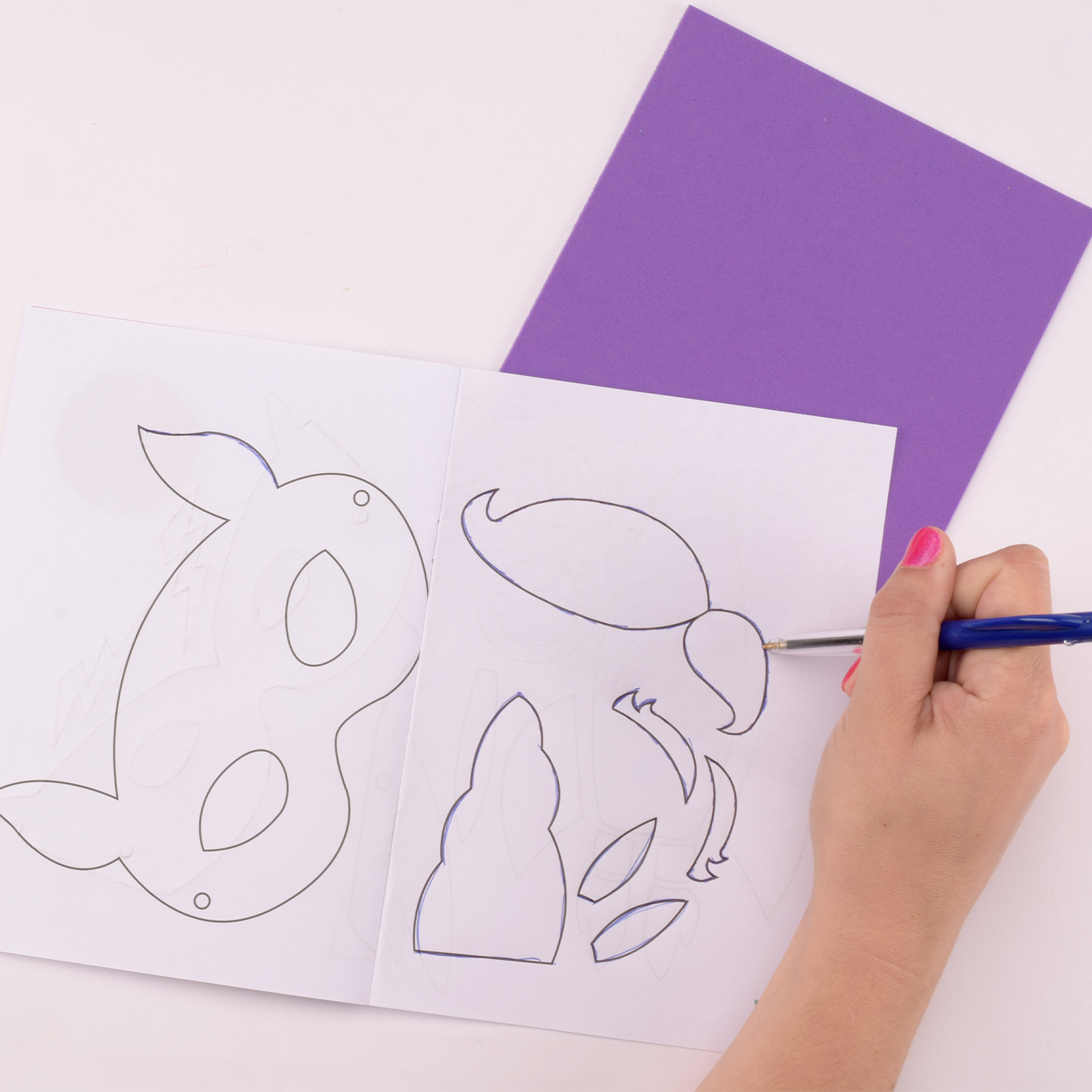 Inizia realizzando la maschera da unicorno. Usa il libretto di istruzioni e tre colori di gomma glitterata del kit. Ricalca le forme dal libretto sulla gomma con una penna, premendo bene per lasciare l’impronta.
