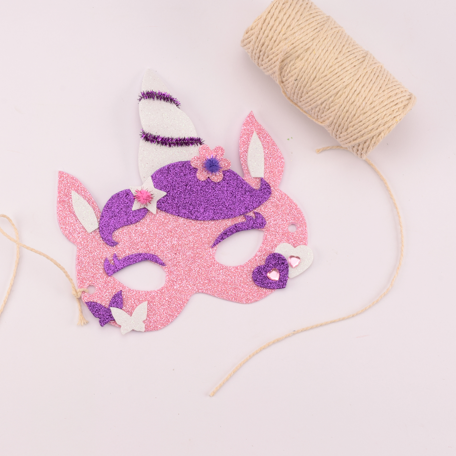 Fissa due cordoncini o elastici nei fori ai lati della maschera da unicorno. Ora è pronta da indossare!