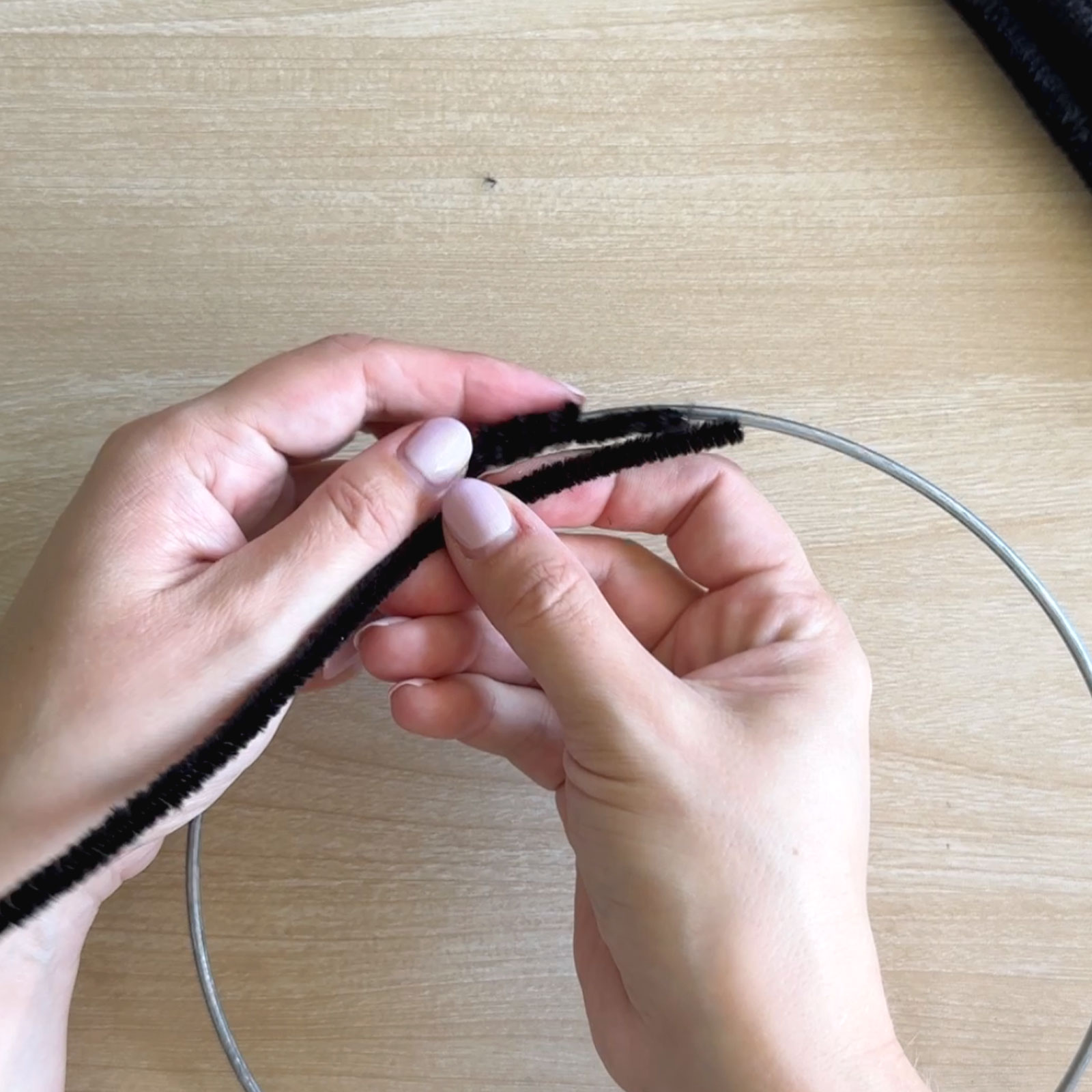 Prendi un anello metallico di 20 cm e uno scovolino nero. Piega una piccola parte della punta e avvolgi saldamente il resto attorno all’estremità e all’anello.