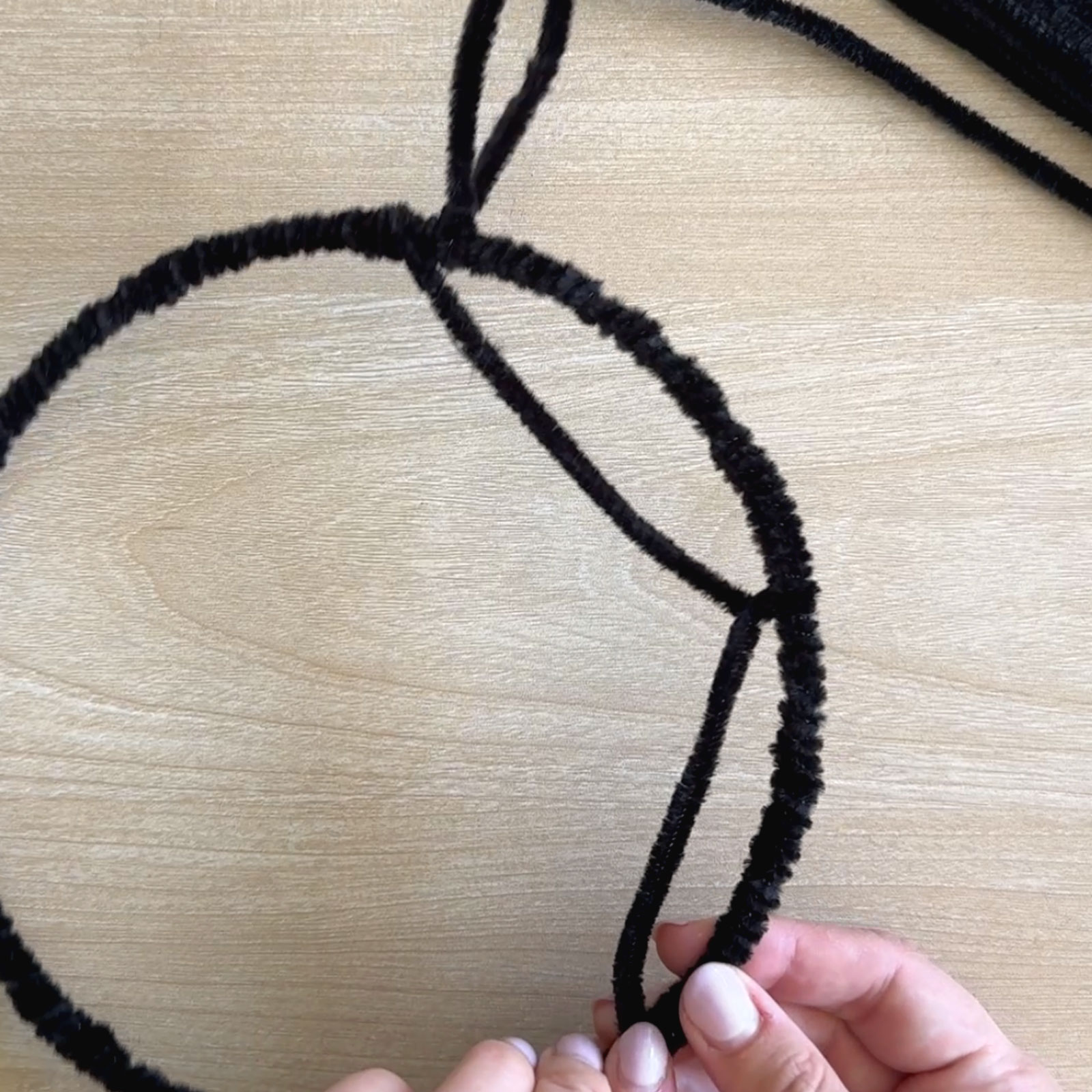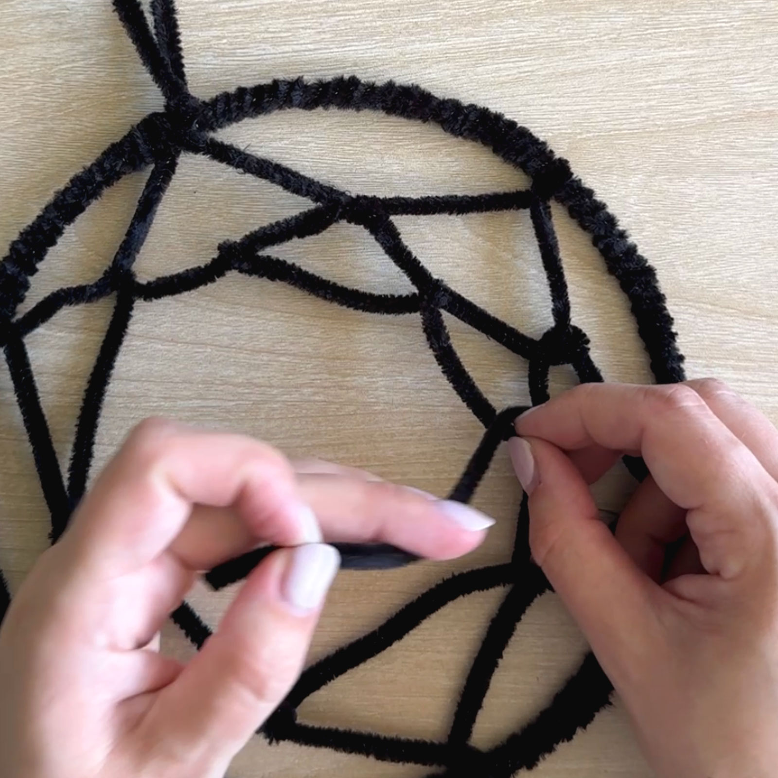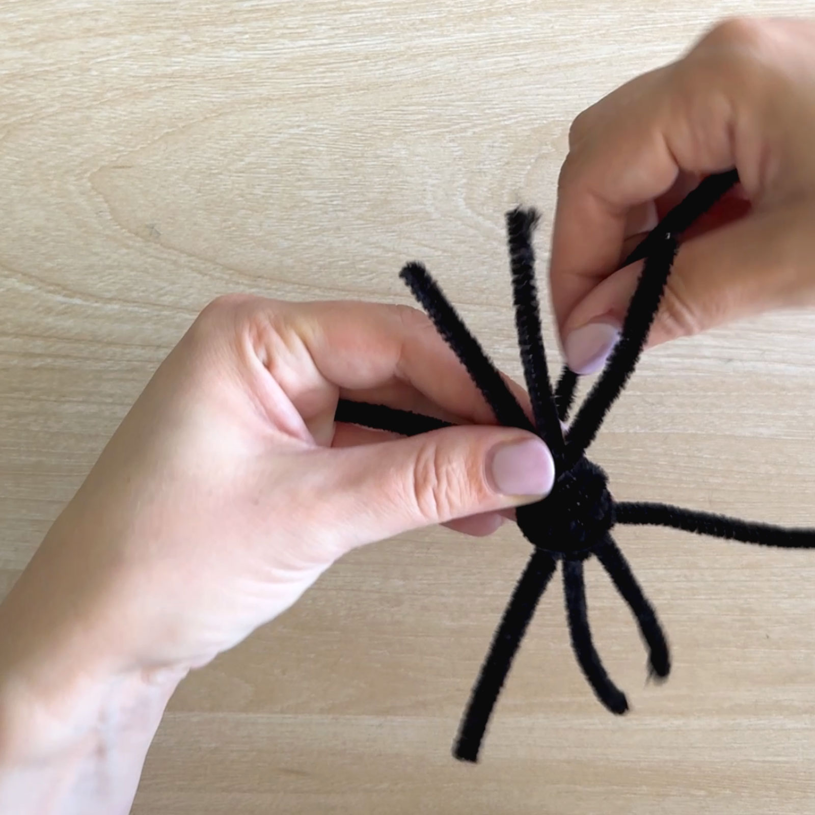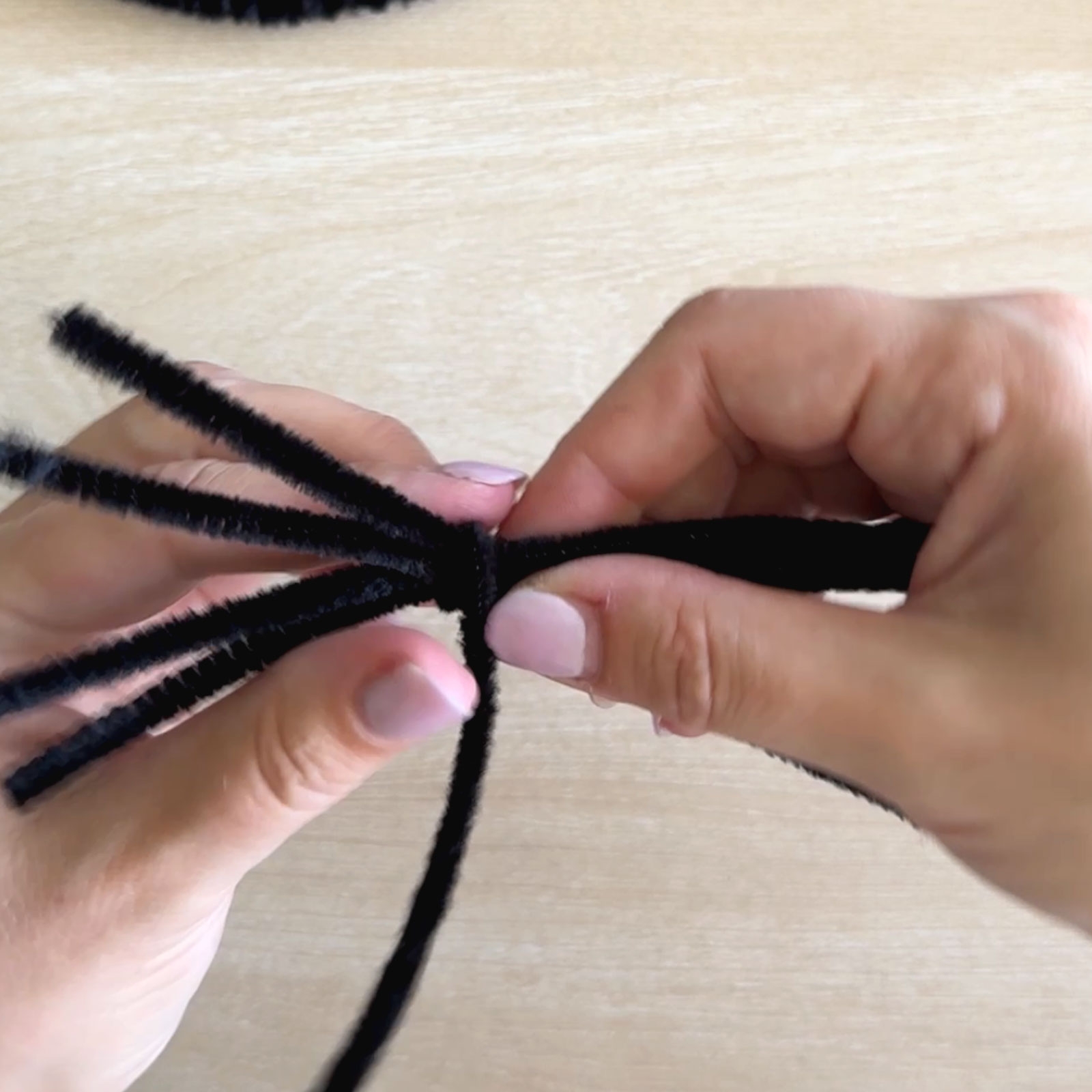 Ora usa altri scovolini neri per la ragnatela. Fissa il primo all’anello, avvolgilo e fissalo di nuovo all’anello a metà della lunghezza.